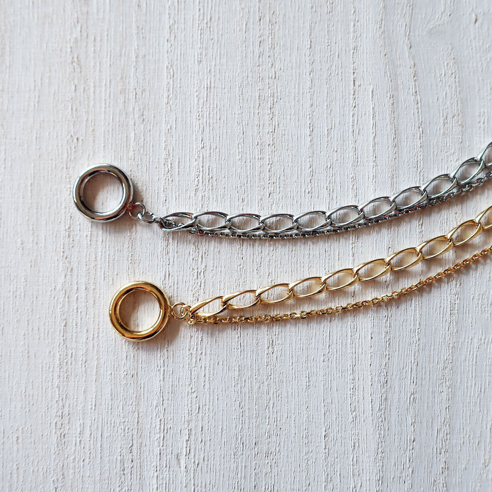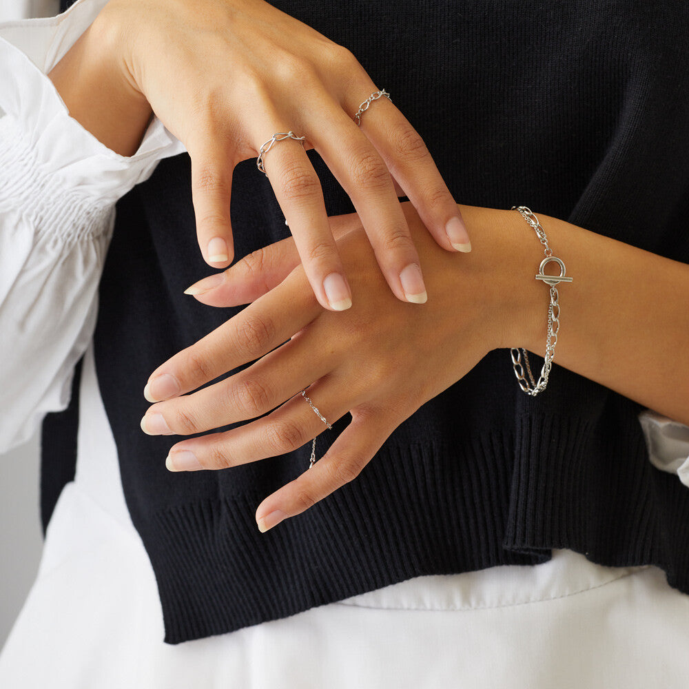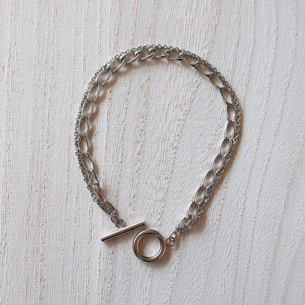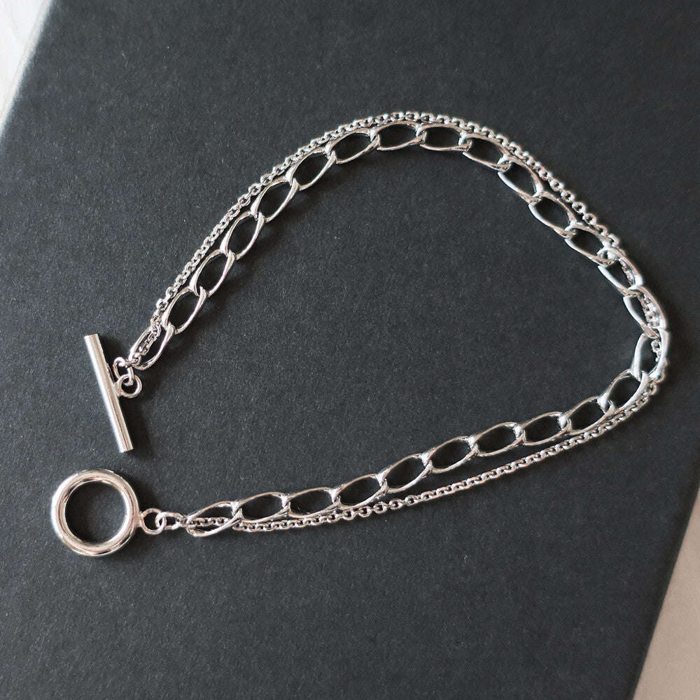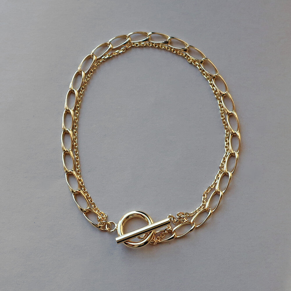 A refined double-chain bracelet featuring a stylish toggle clasp, designed to bring both elegance and modernity to your everyday look. The twisted azuki chain adds subtle texture and sophistication, while the toggle closure highlights the bracelet as a statement piece. Crafted with a nickel-free finish for allergy-safe comfort, this versatile bracelet layers beautifully with other jewelry or stands out on its own.