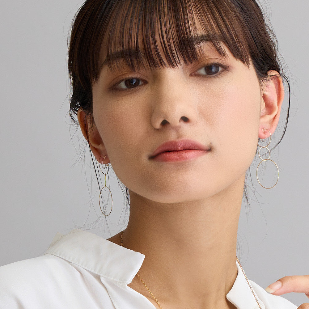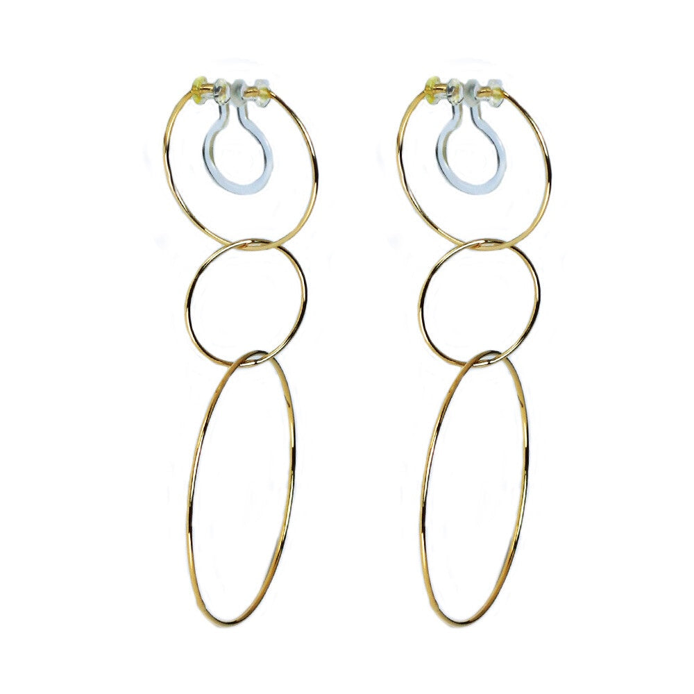 Modern and lightweight, these clip-on earrings feature three interlinked gold hoops for a sleek, elongated look. Designed for non-pierced ears, the clear silicone clips ensure comfort and secure wear all day. Perfect for both casual and dressy outfits. Available in gold (K18 gold plating). Nickel-free and allergy-safe.
