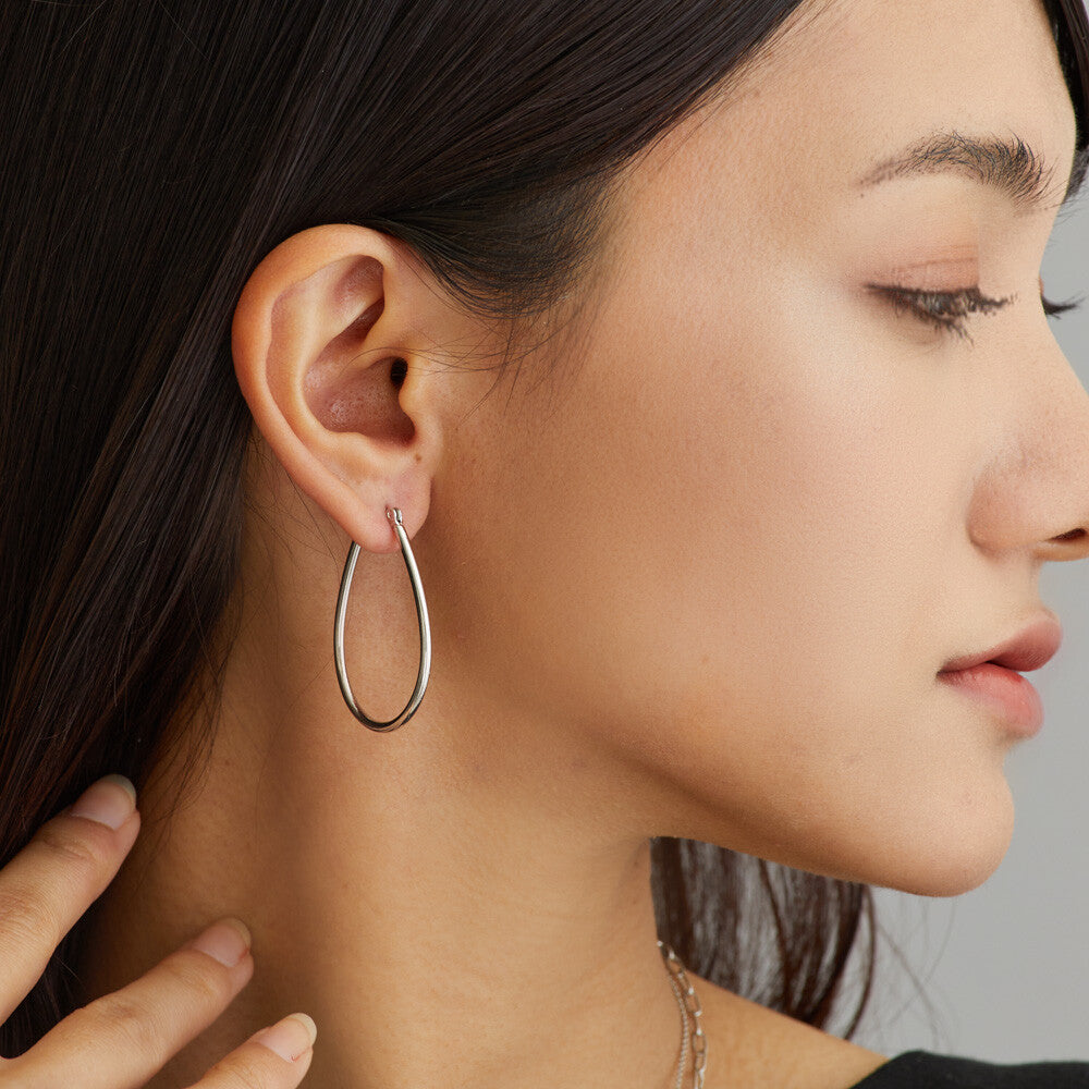 Sleek drop-shaped hoop earrings crafted in pure titanium with a modern, minimalist design. The catchless mechanism allows for quick and easy wear without the need for earring backs—simply snap into place for a secure fit that won’t slip off. Lightweight yet bold, these oval hoops add a sophisticated statement to your everyday style. Allergy-safe with titanium posts, making them a perfect option for sensitive ears.