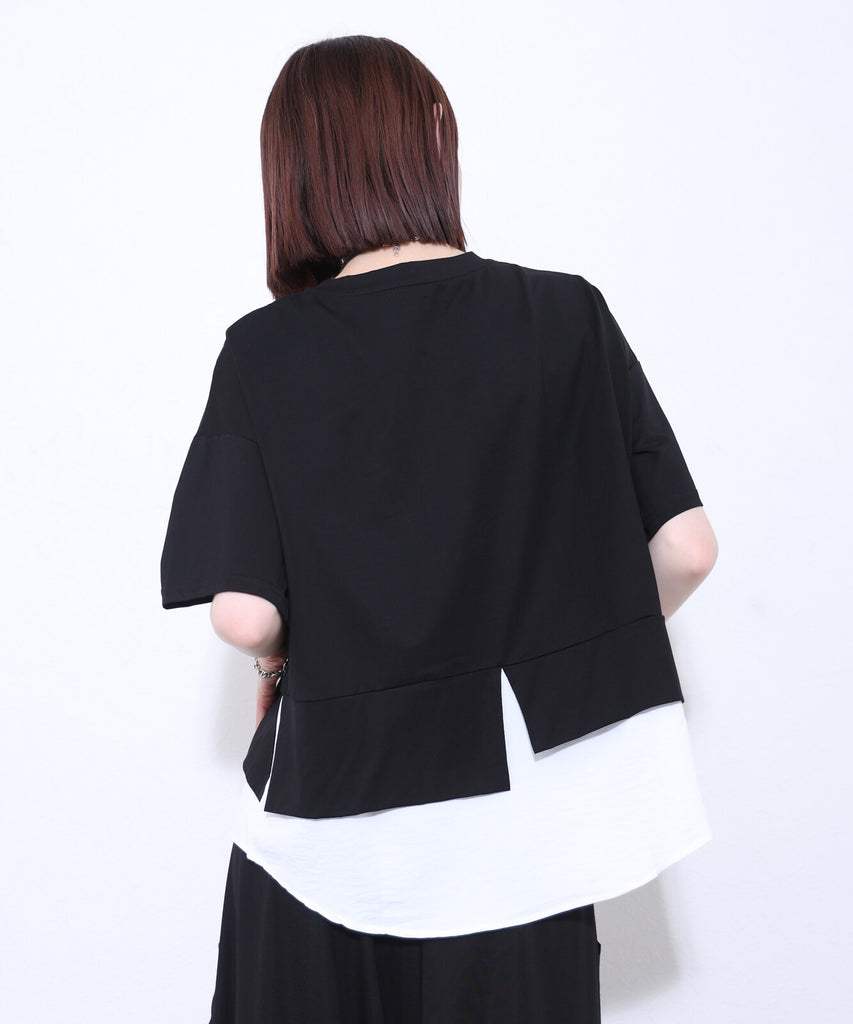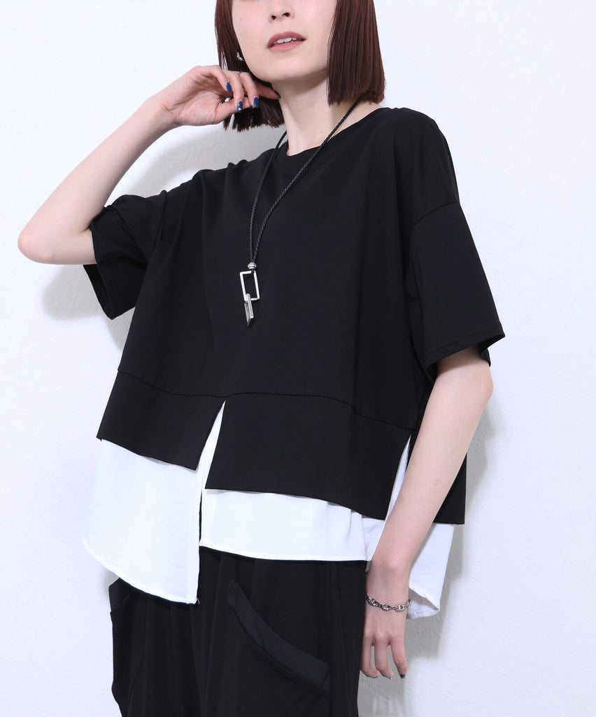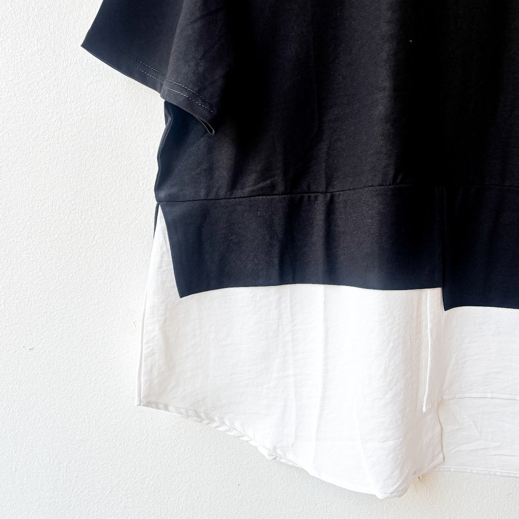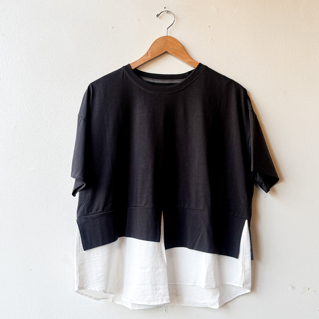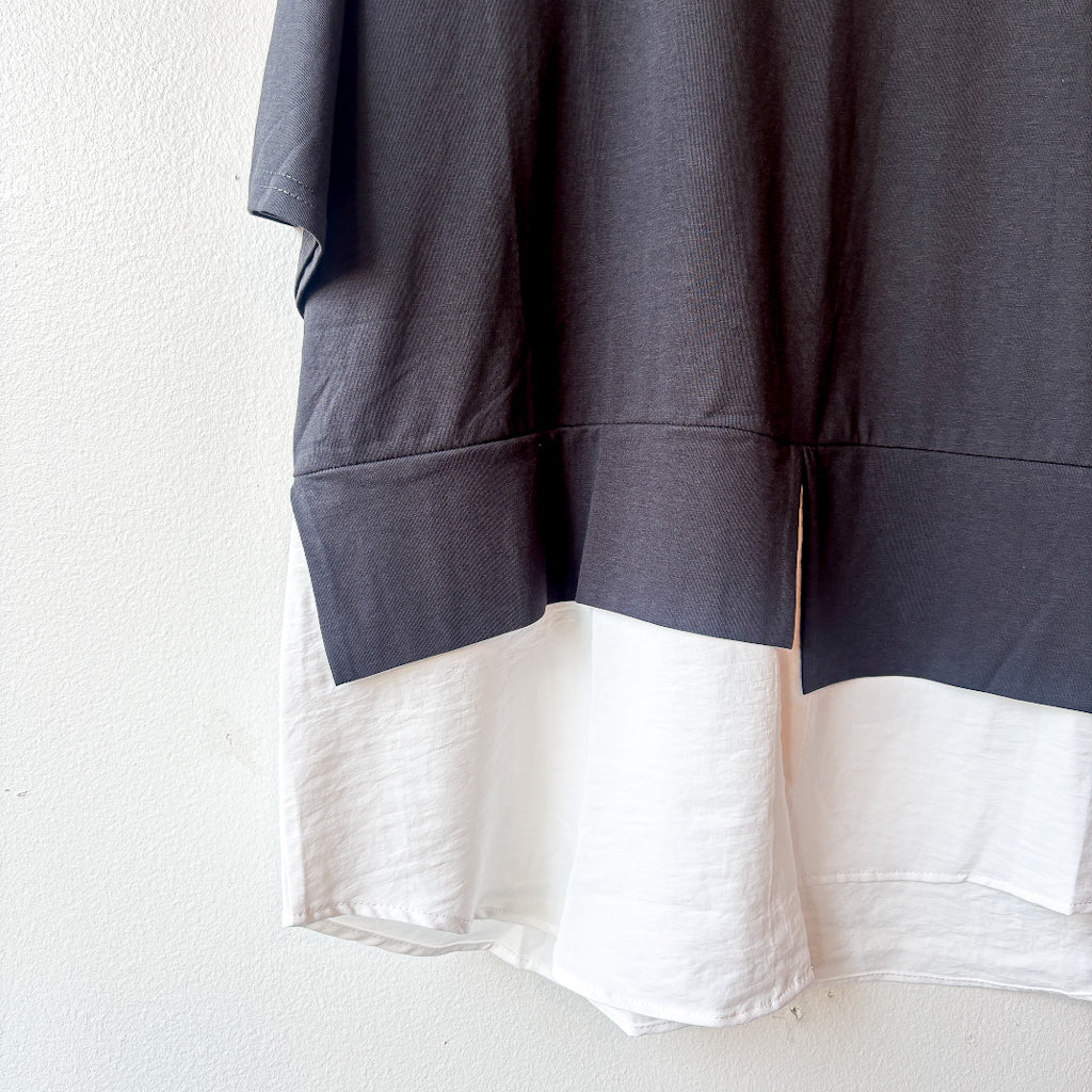 Meet your new everyday essential with a refined twist. This layered‑look tee features a clean outer shell and a longer, contrasting underlayer that creates a chic, effortless silhouette. Strategically placed side slits add a subtle edge, while soft stretch knit ensures all-day comfort. Minimalist and versatile, it’s the perfect pairing with jeans, culottes, or skirts.