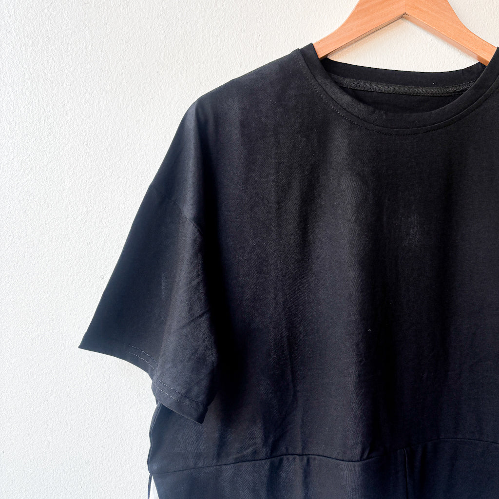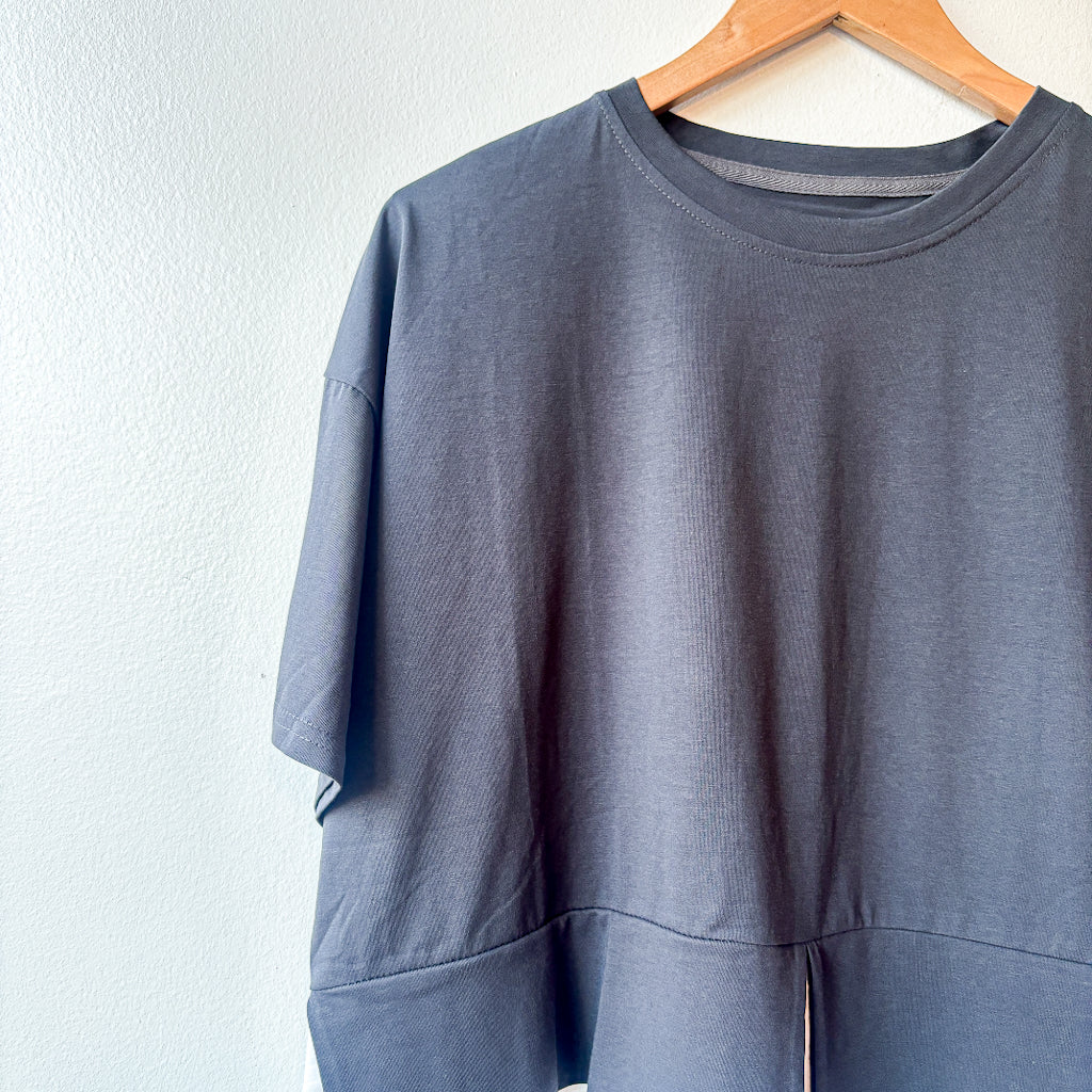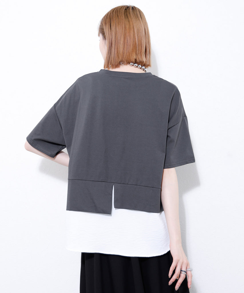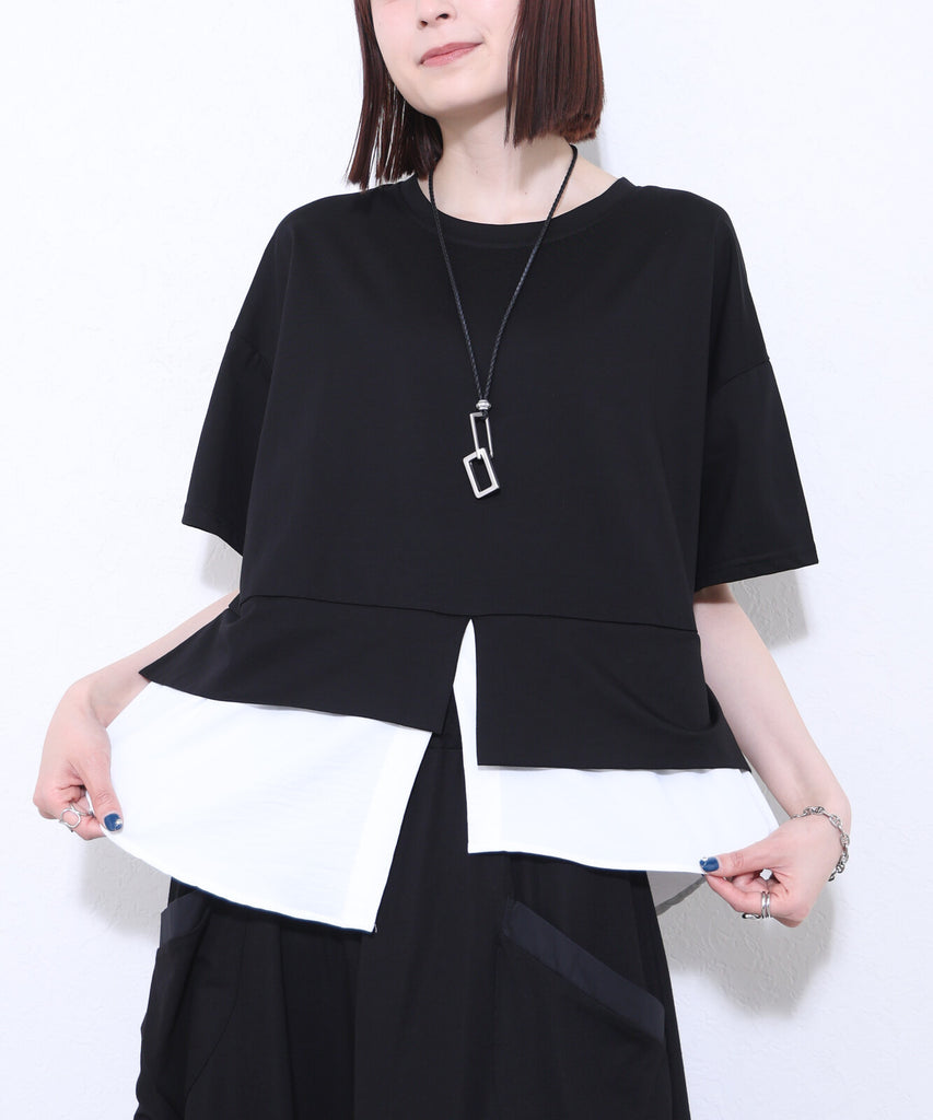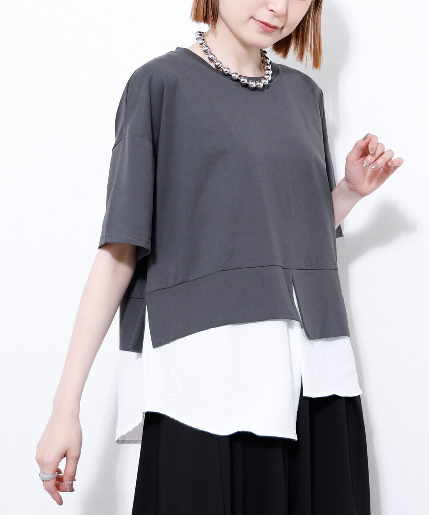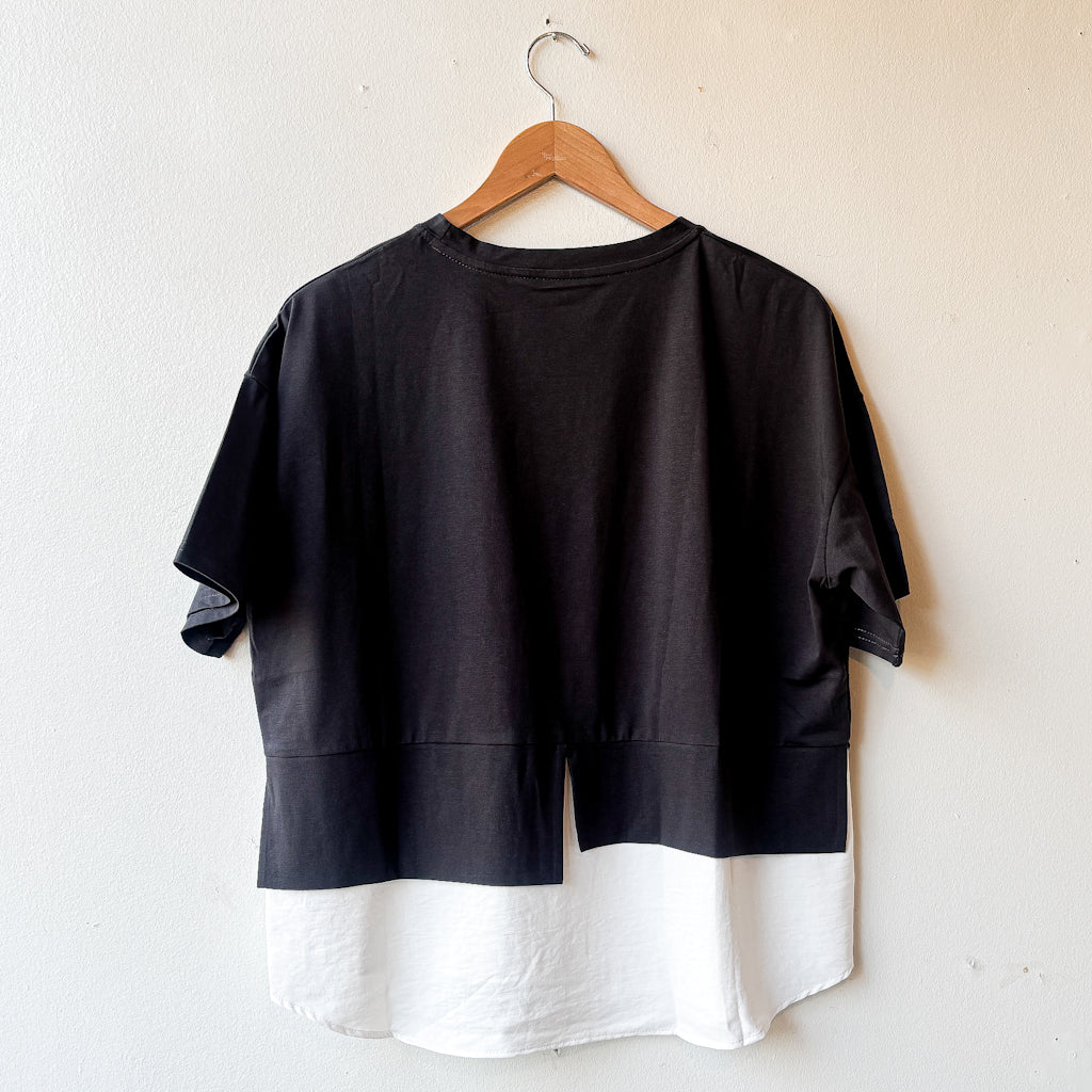 Meet your new everyday essential with a refined twist. This layered‑look tee features a clean outer shell and a longer, contrasting underlayer that creates a chic, effortless silhouette. Strategically placed side slits add a subtle edge, while soft stretch knit ensures all-day comfort. Minimalist and versatile, it’s the perfect pairing with jeans, culottes, or skirts.