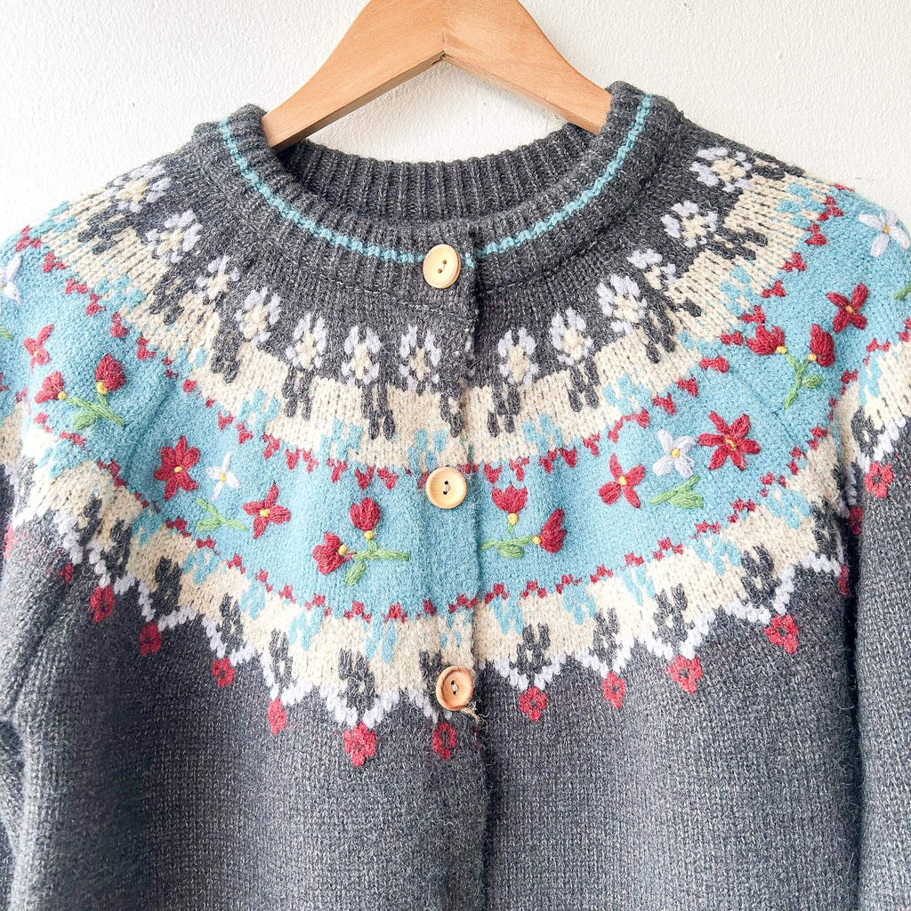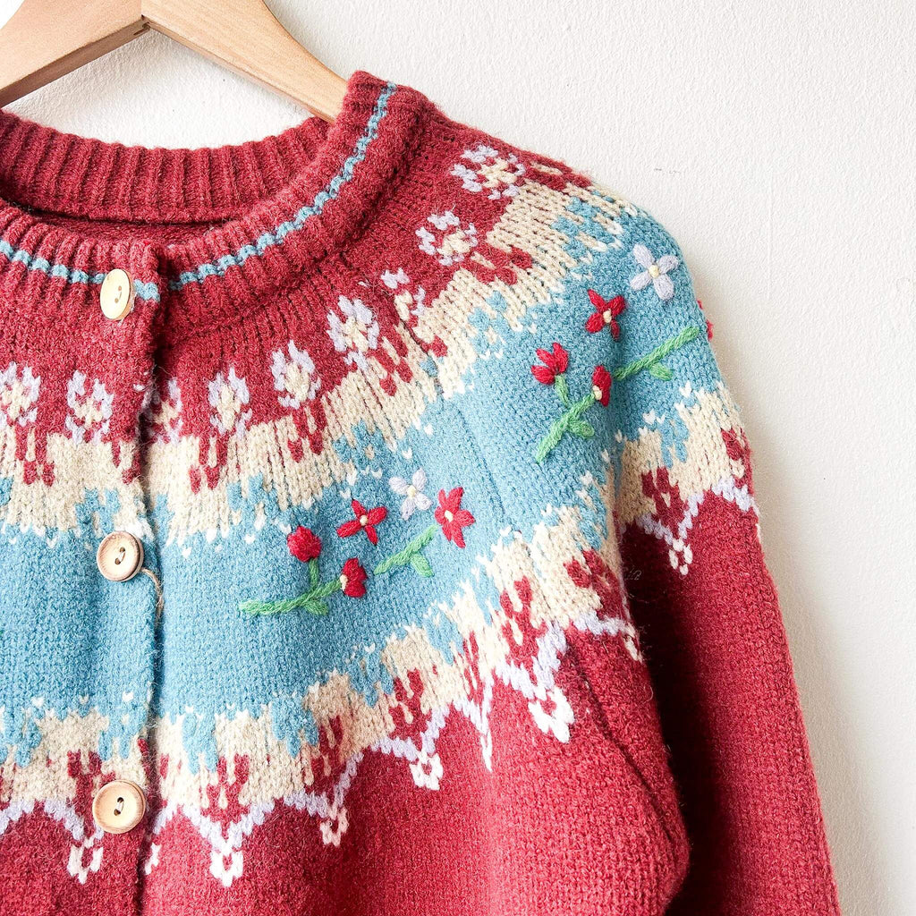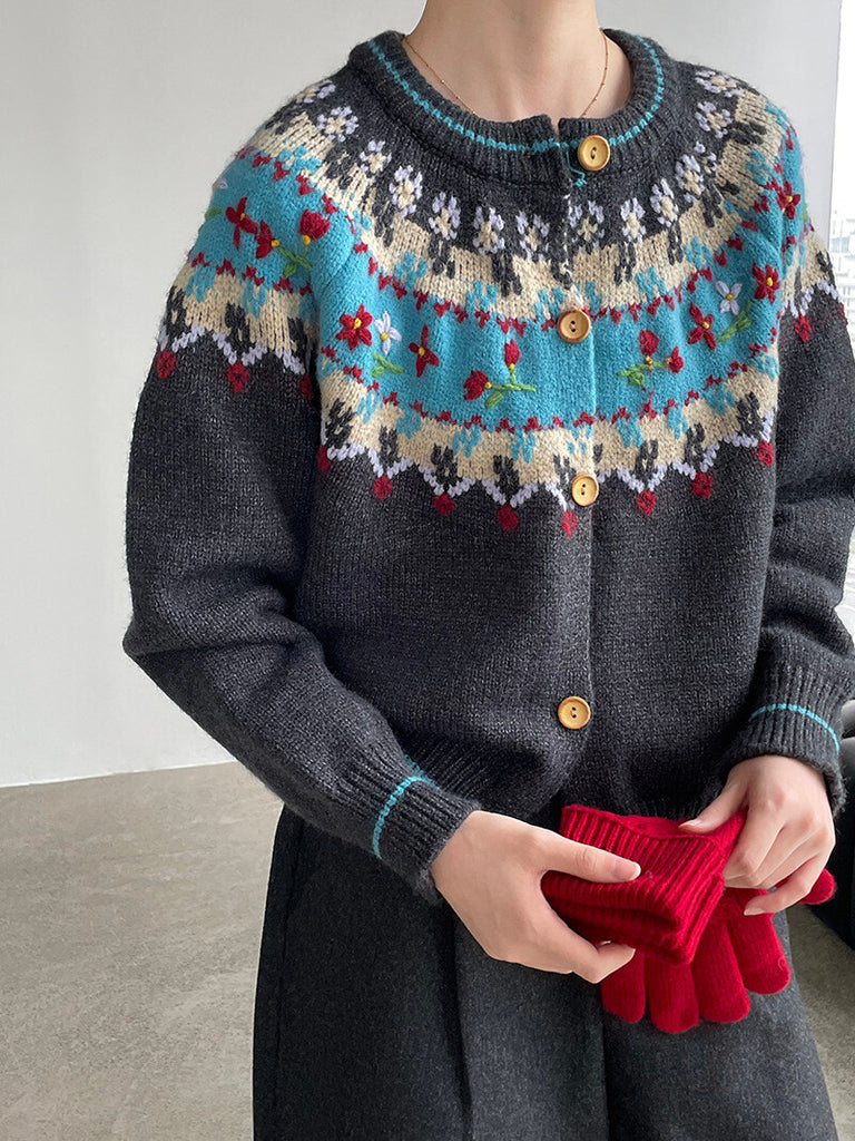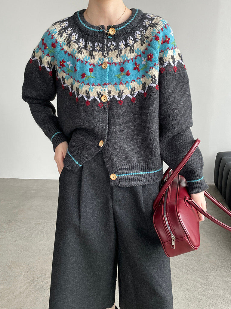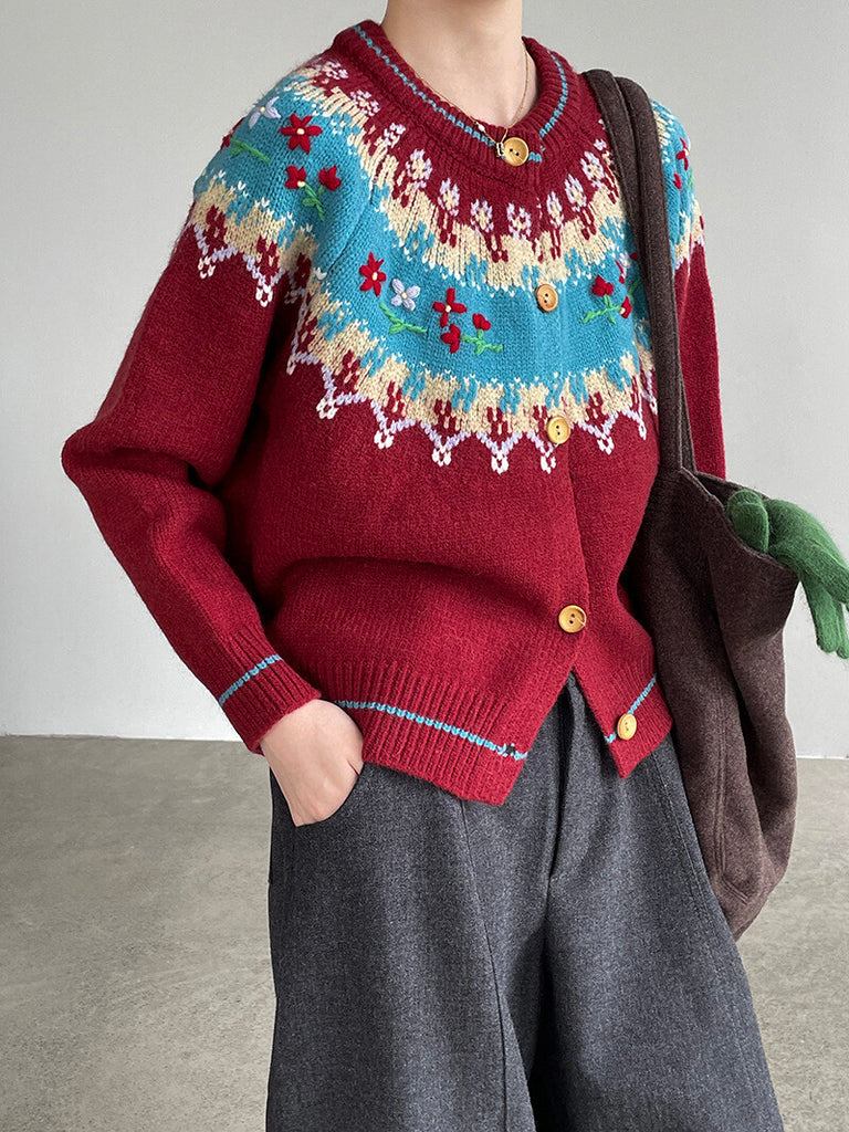 Add a touch of retro charm to your winter wardrobe with this embroidered floral knit cardigan. Featuring a colorful jacquard pattern across the chest and shoulders, this crew neck cardigan blends vintage inspiration with cozy modern styling. The wooden buttons and intricate floral details bring a handcrafted feel to the design, making it both playful and timeless.