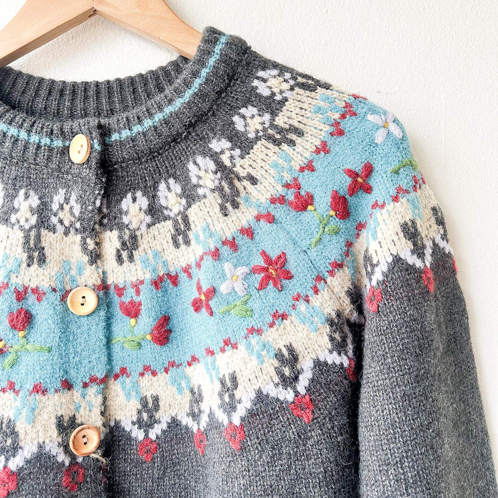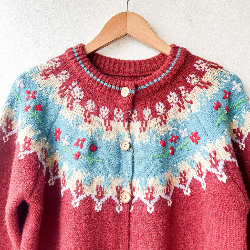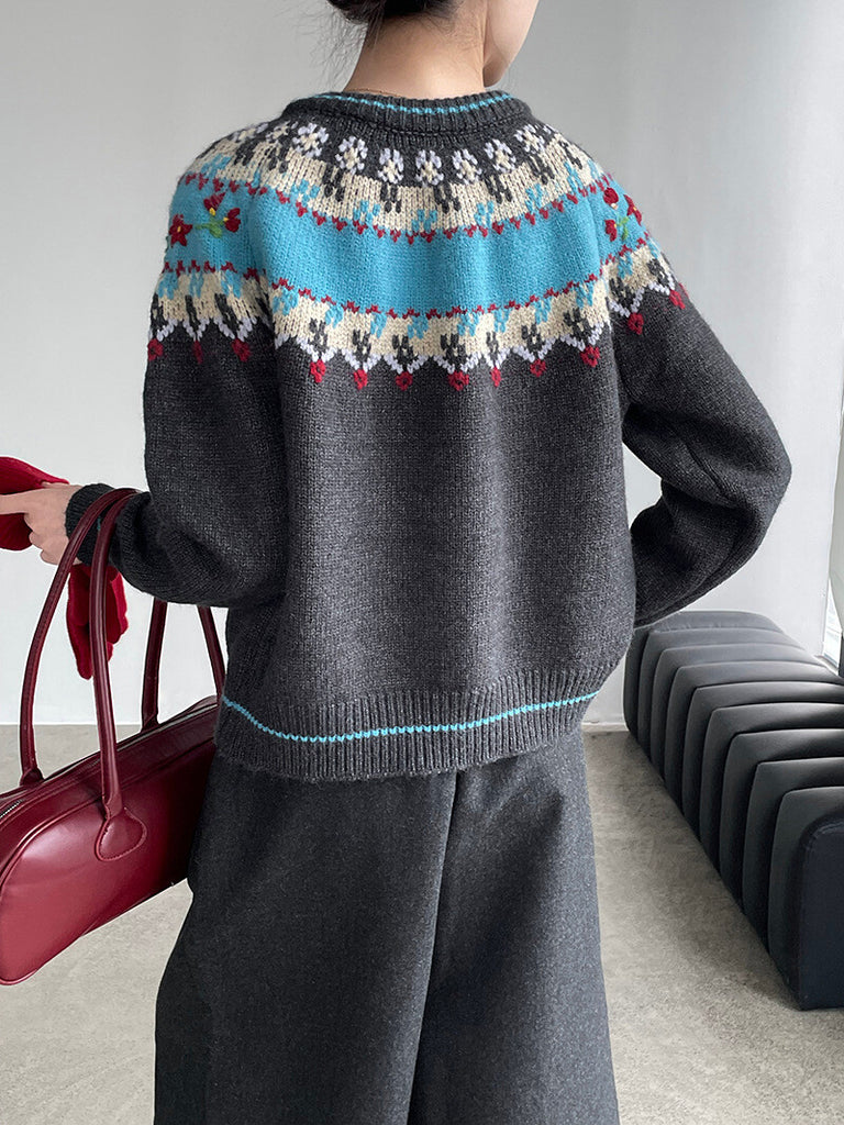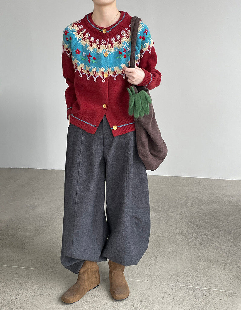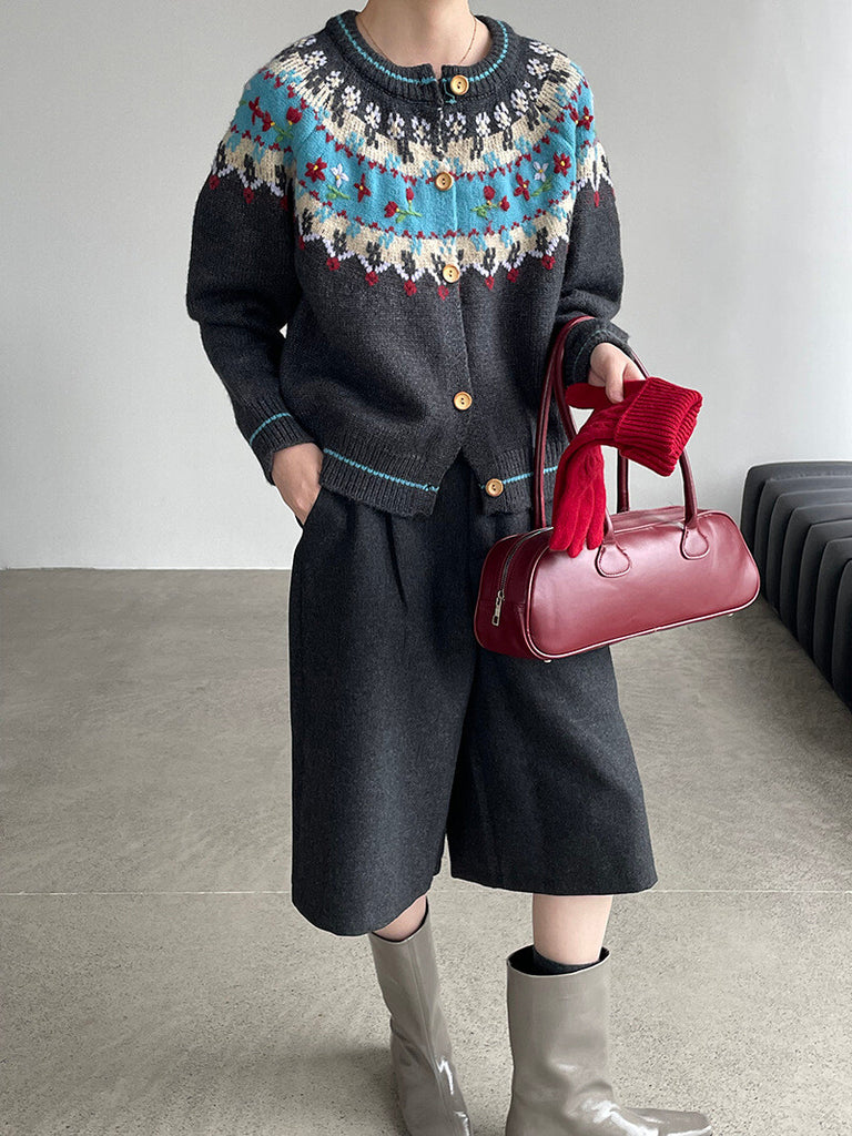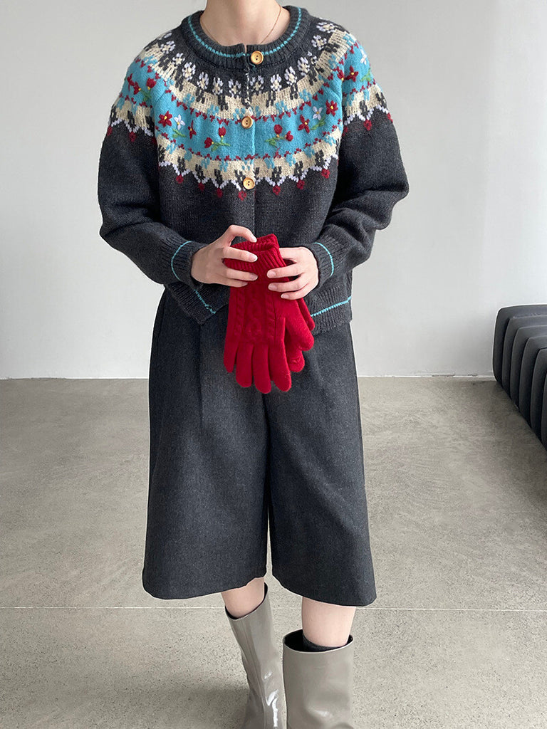 Add a touch of retro charm to your winter wardrobe with this embroidered floral knit cardigan. Featuring a colorful jacquard pattern across the chest and shoulders, this crew neck cardigan blends vintage inspiration with cozy modern styling. The wooden buttons and intricate floral details bring a handcrafted feel to the design, making it both playful and timeless.
