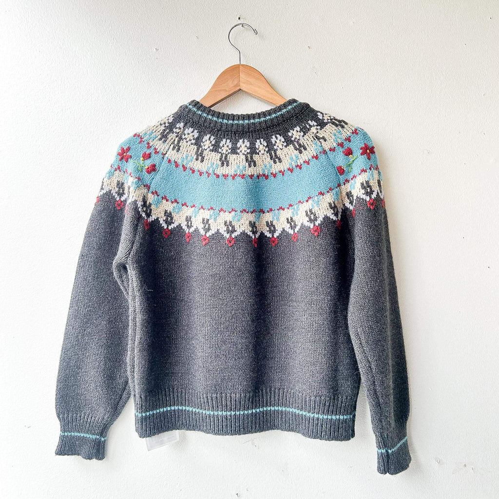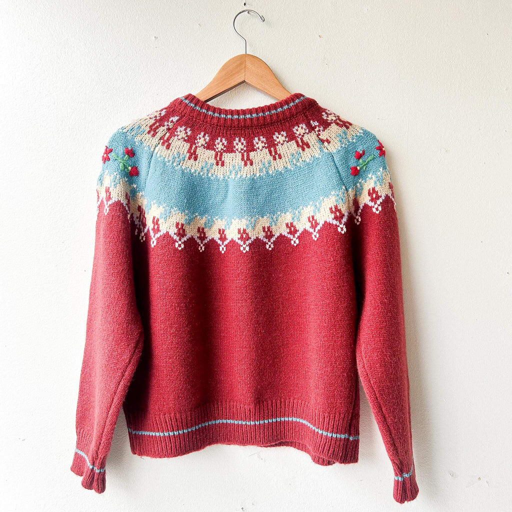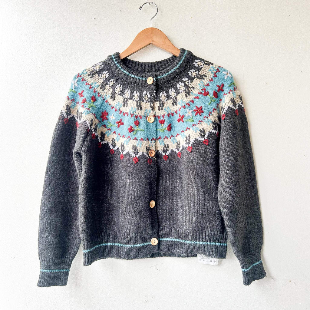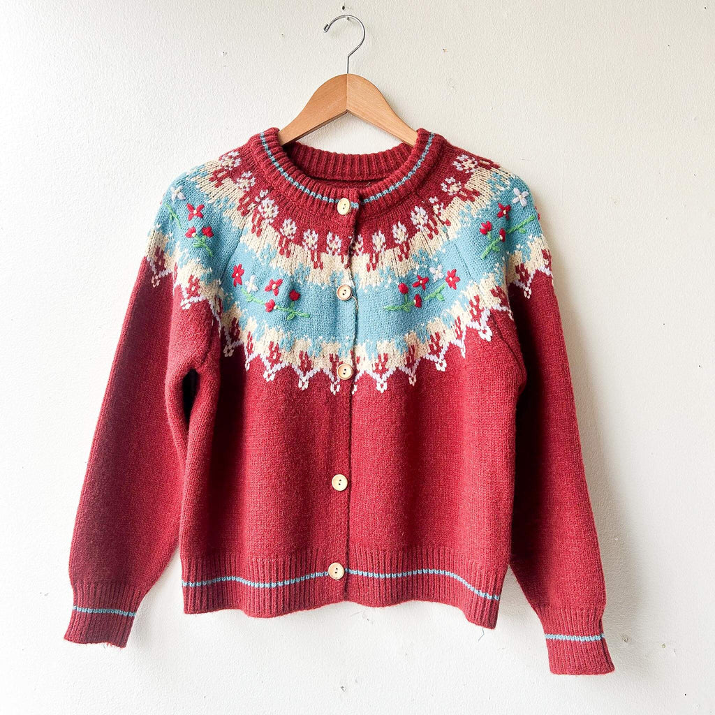 Add a touch of retro charm to your winter wardrobe with this embroidered floral knit cardigan. Featuring a colorful jacquard pattern across the chest and shoulders, this crew neck cardigan blends vintage inspiration with cozy modern styling. The wooden buttons and intricate floral details bring a handcrafted feel to the design, making it both playful and timeless.