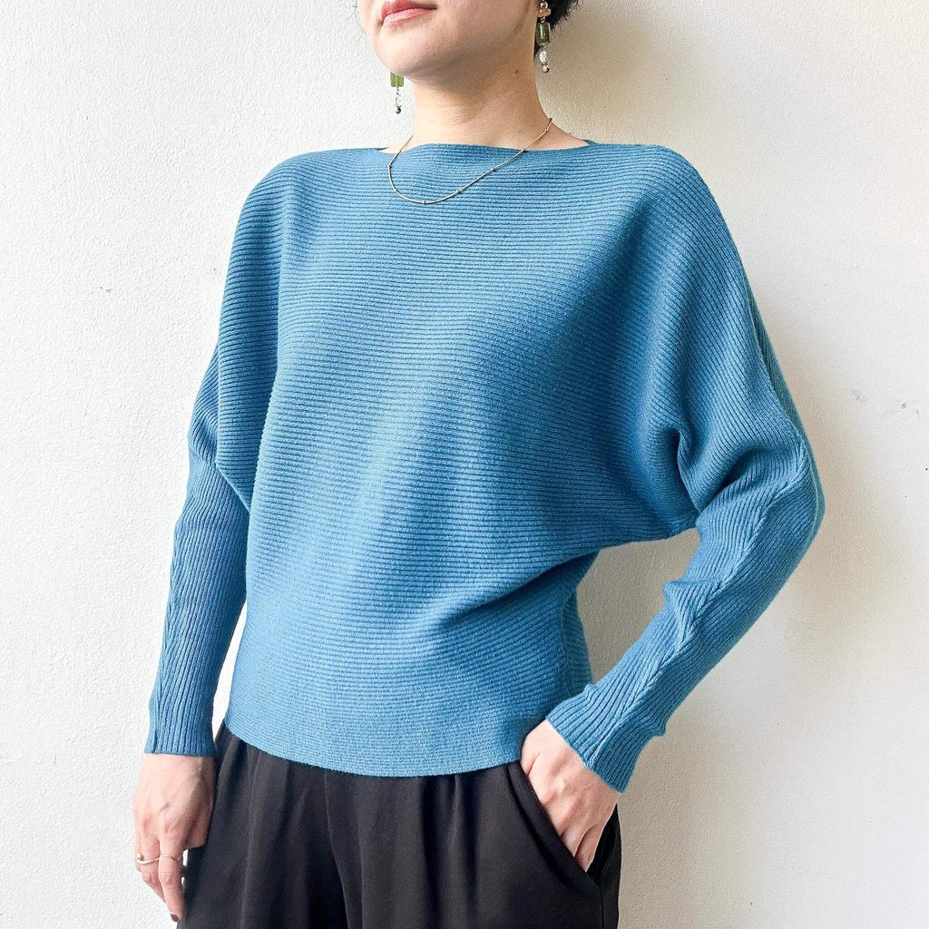 Effortlessly elegant, this soft knit pullover features a relaxed dolman silhouette, gently tapered sleeves, and a flattering boat-neck crewline. Its versatile design complements everything from jeans to skirts—perfect for layering or solo wear.