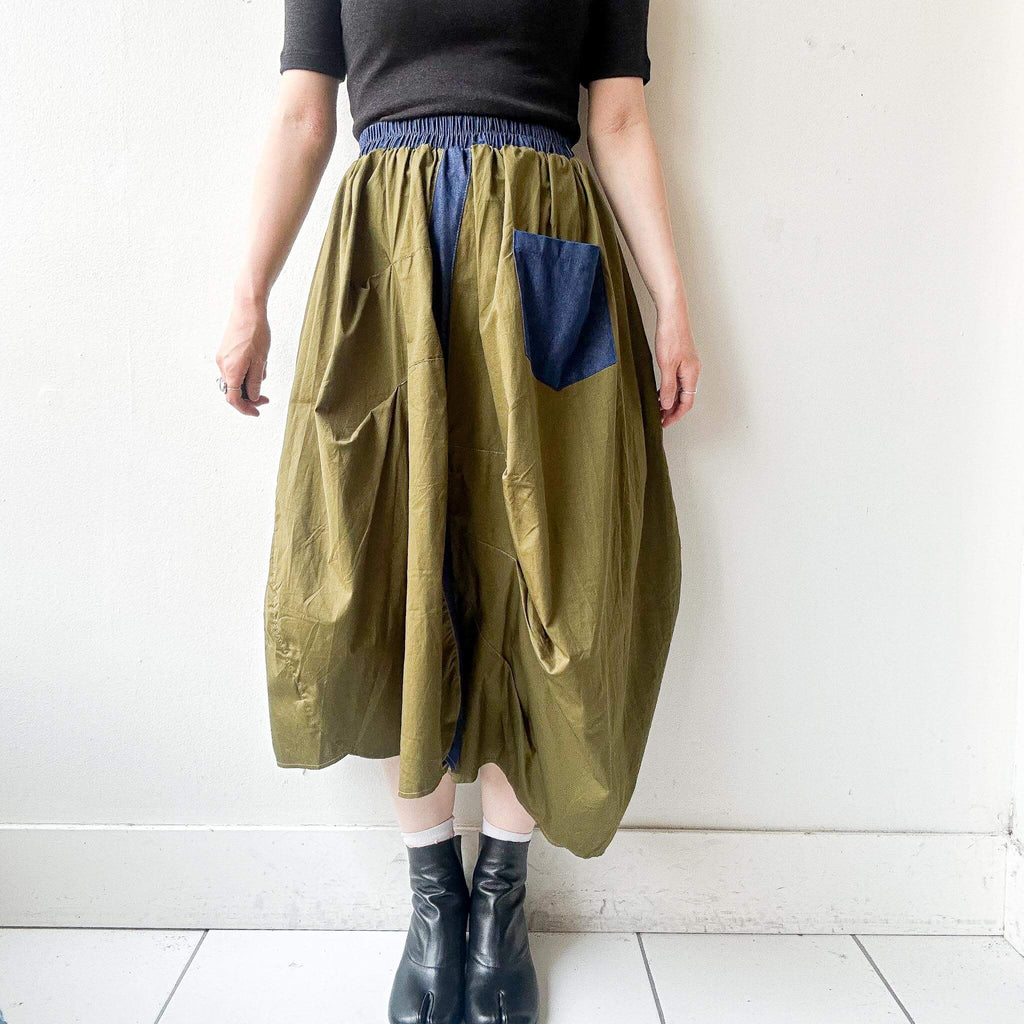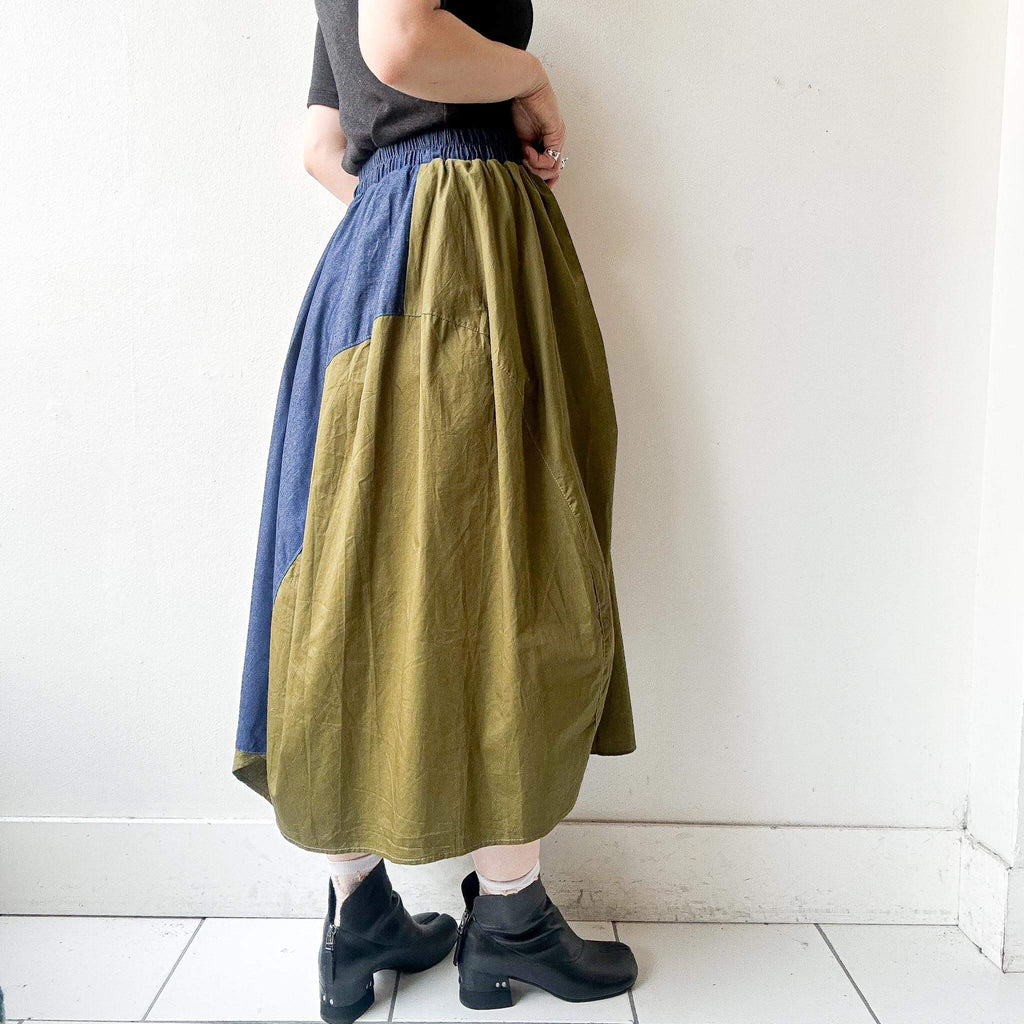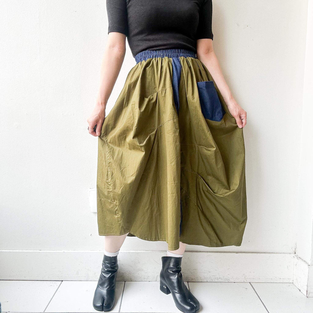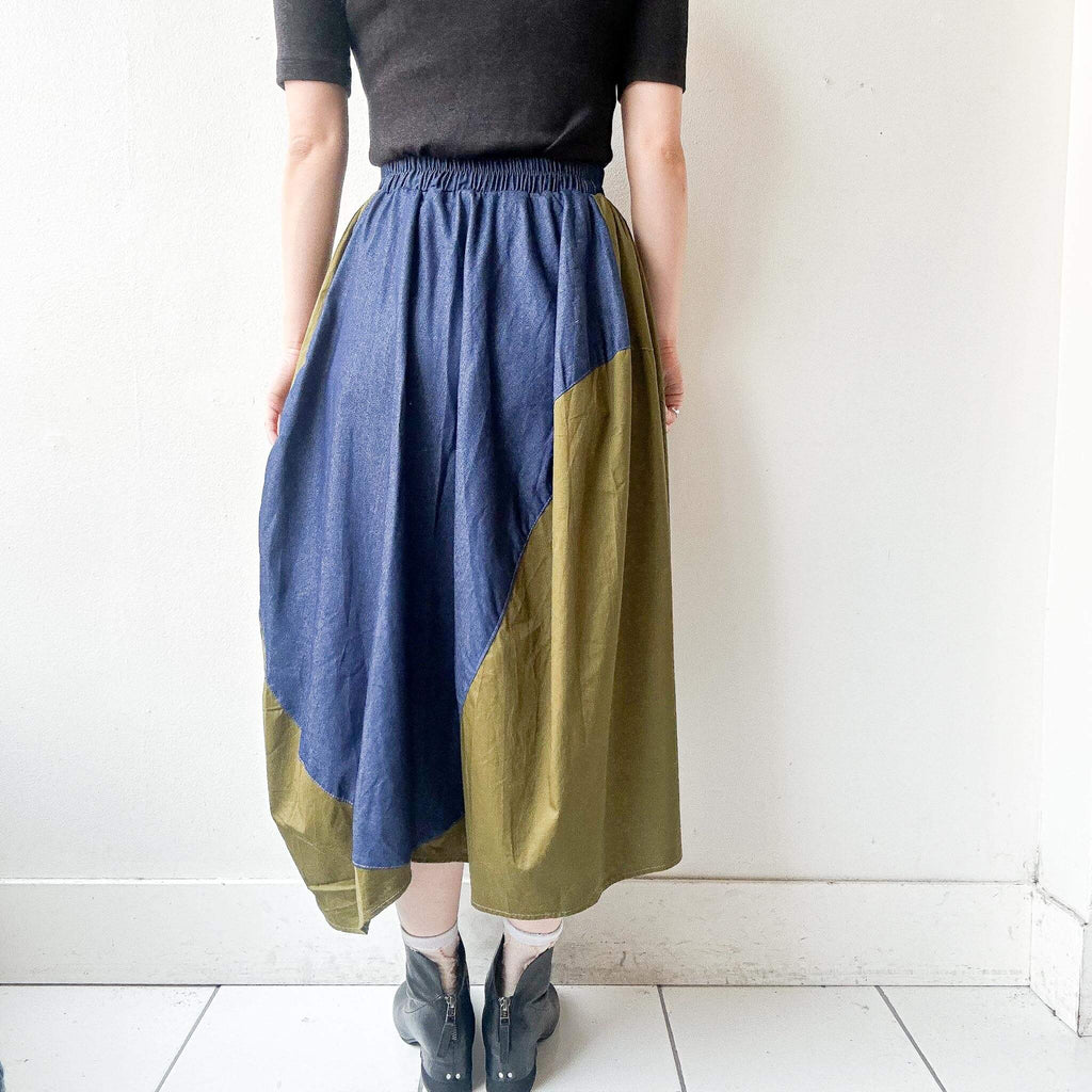 Step into bold street-inspired fashion with this bi-color military skirt, combining khaki green with denim blue contrast details. The asymmetric drape and oversized patch pocket add a utilitarian edge, while the elastic waistband ensures comfort and easy wear. With its modern silhouette and relaxed length, this skirt pairs effortlessly with minimalist tops and chunky shoes for a statement look.