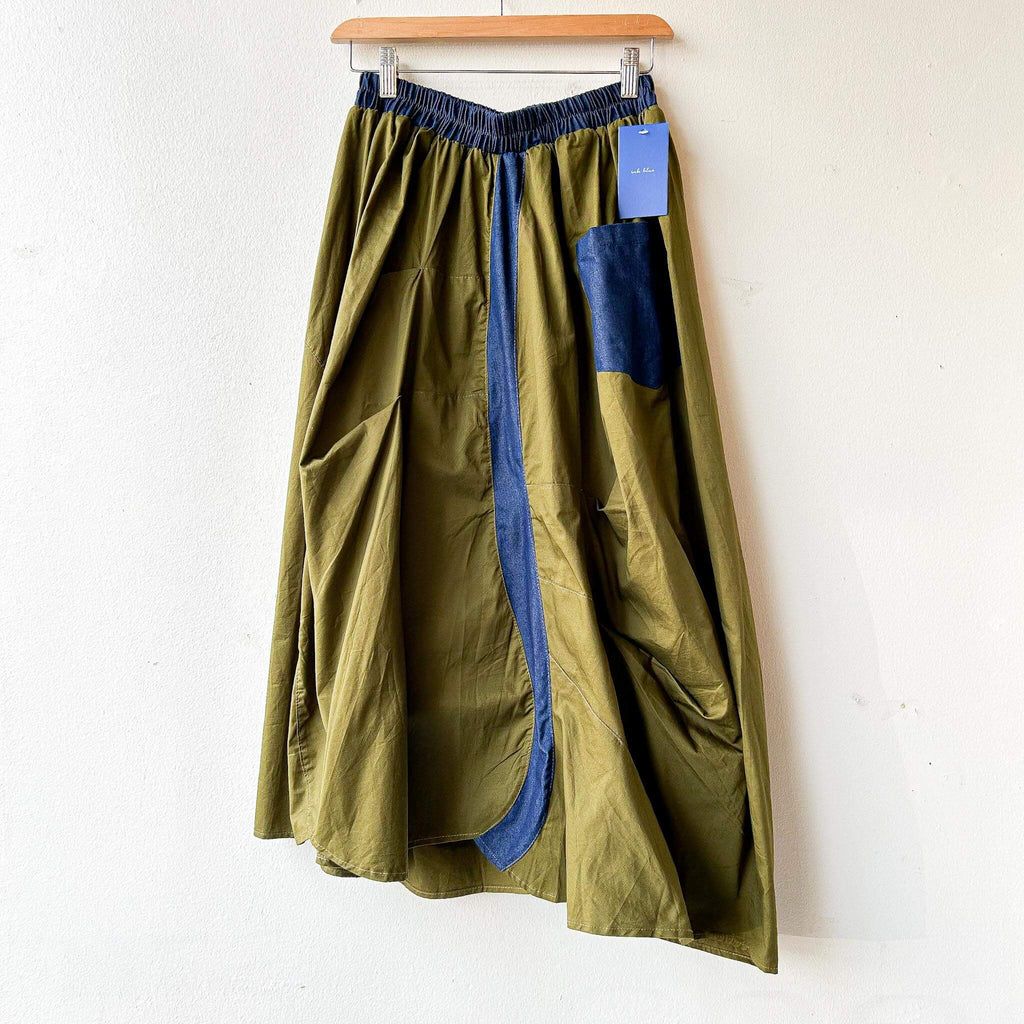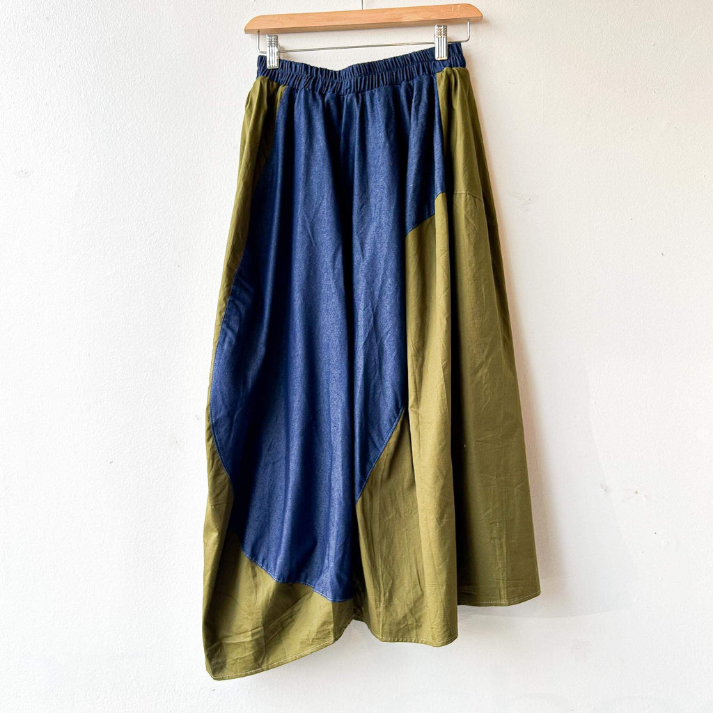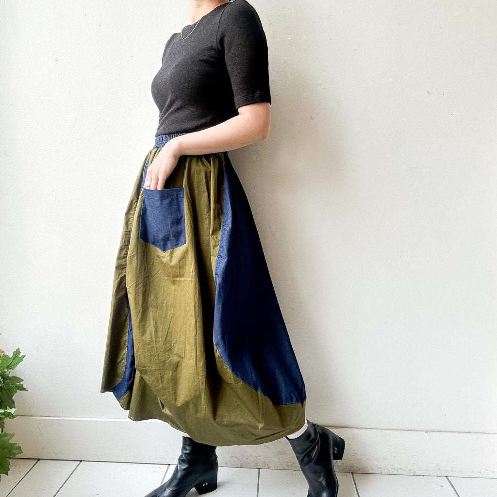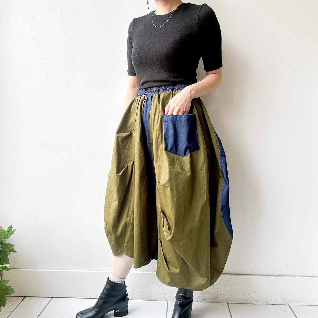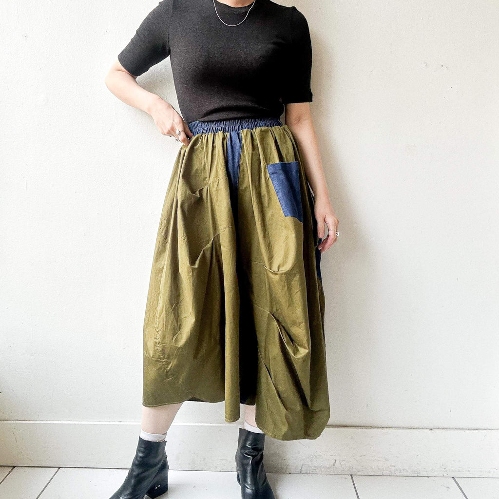 Step into bold street-inspired fashion with this bi-color military skirt, combining khaki green with denim blue contrast details. The asymmetric drape and oversized patch pocket add a utilitarian edge, while the elastic waistband ensures comfort and easy wear. With its modern silhouette and relaxed length, this skirt pairs effortlessly with minimalist tops and chunky shoes for a statement look.