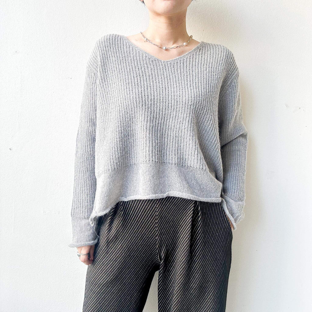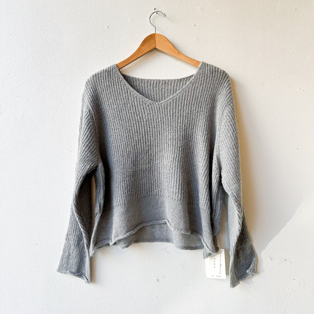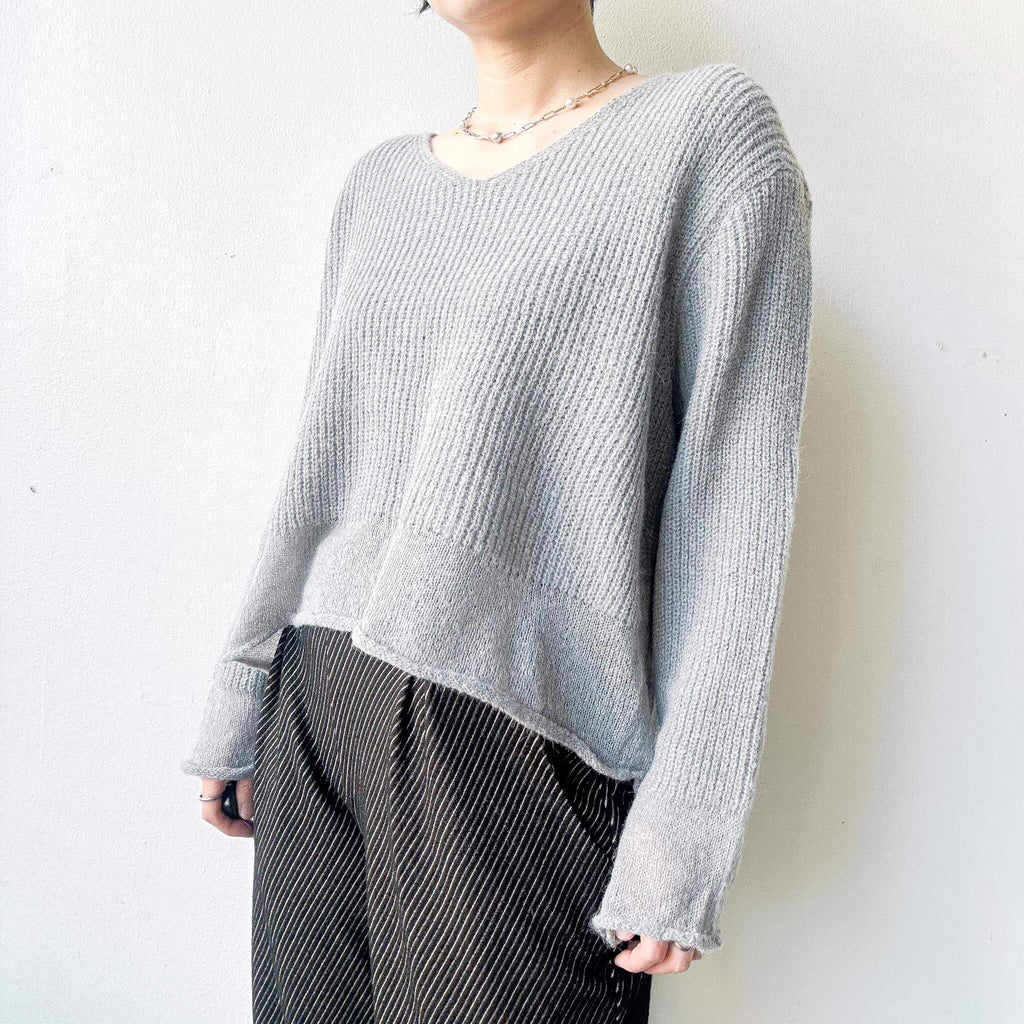 Lightweight wool-blend sweater perfect for early autumn. Soft and breathable with a relaxed V-neck design, it offers effortless comfort and style. The slightly cropped silhouette pairs beautifully with skirts or pants, making it a versatile everyday essential.