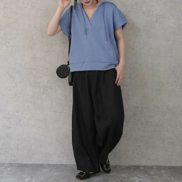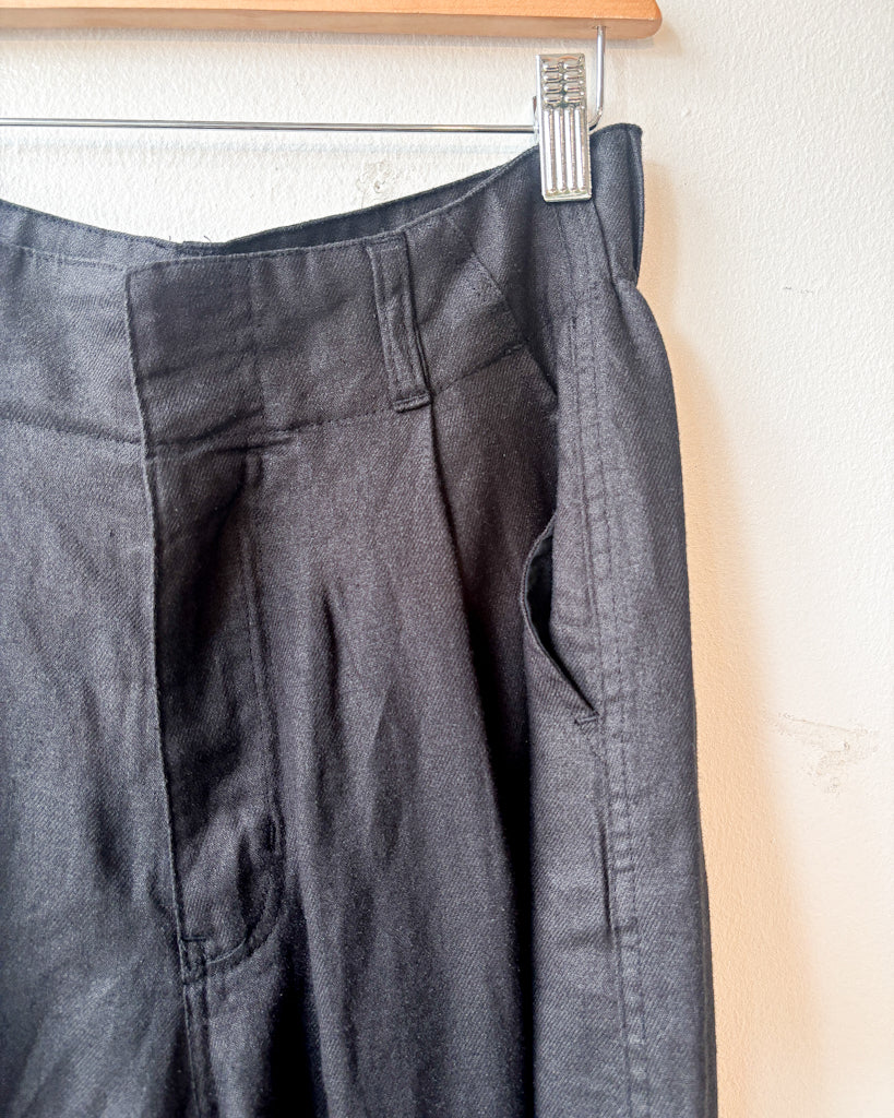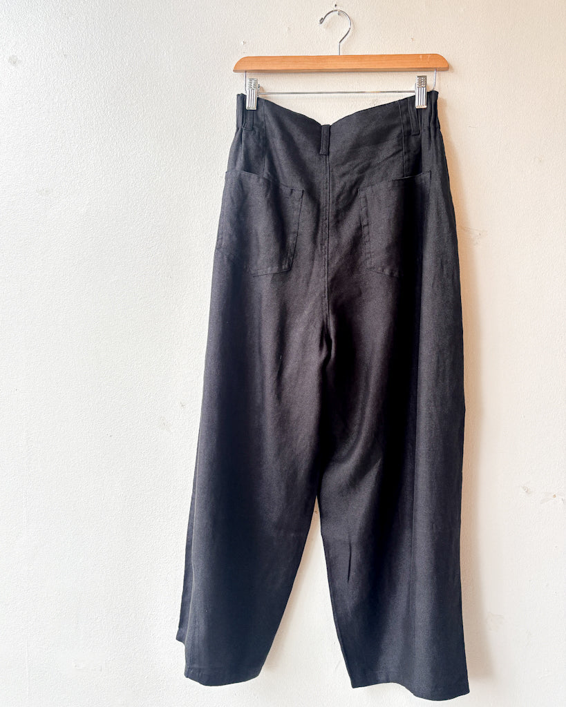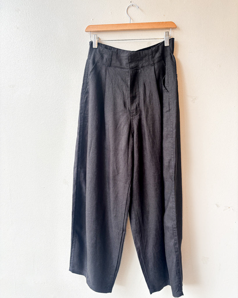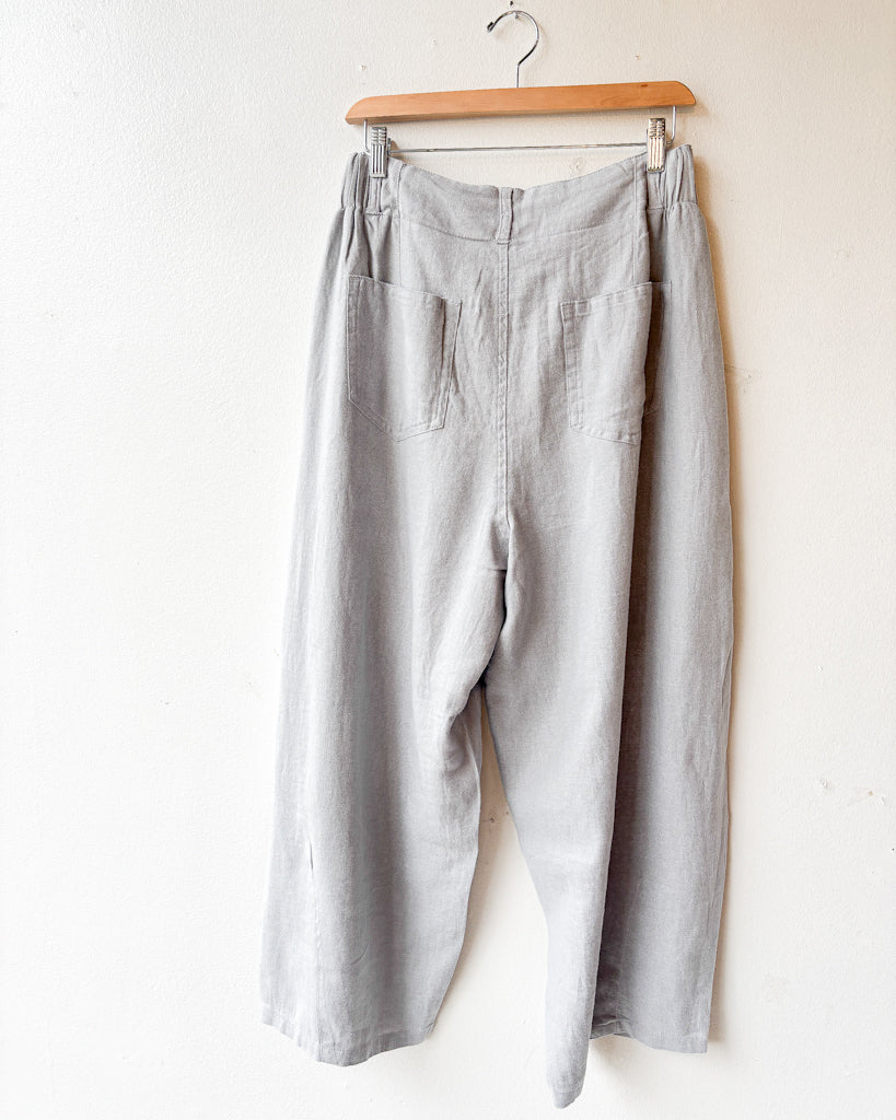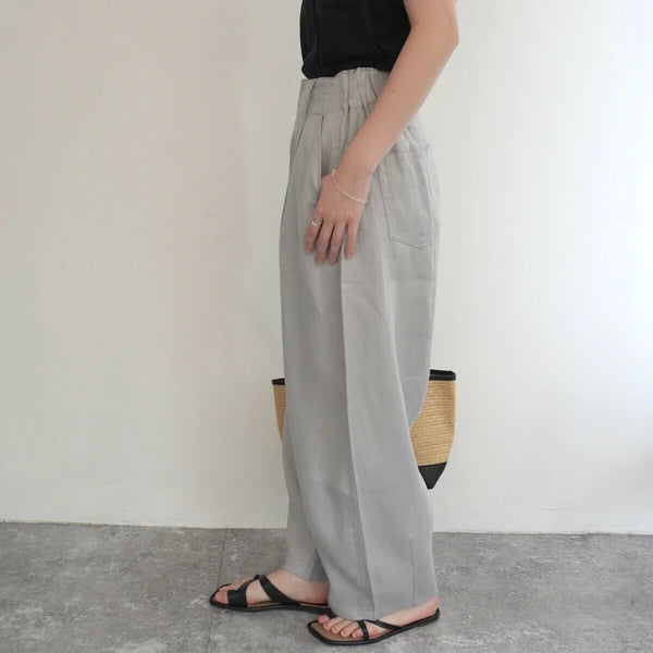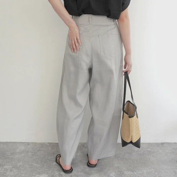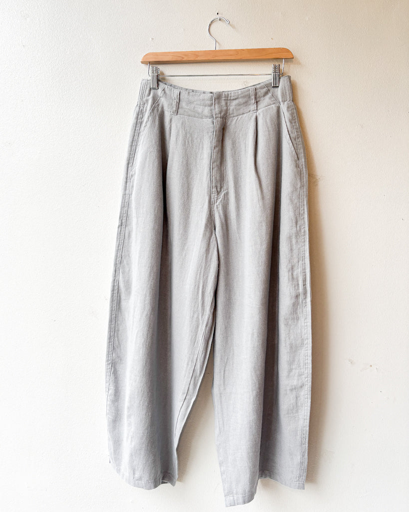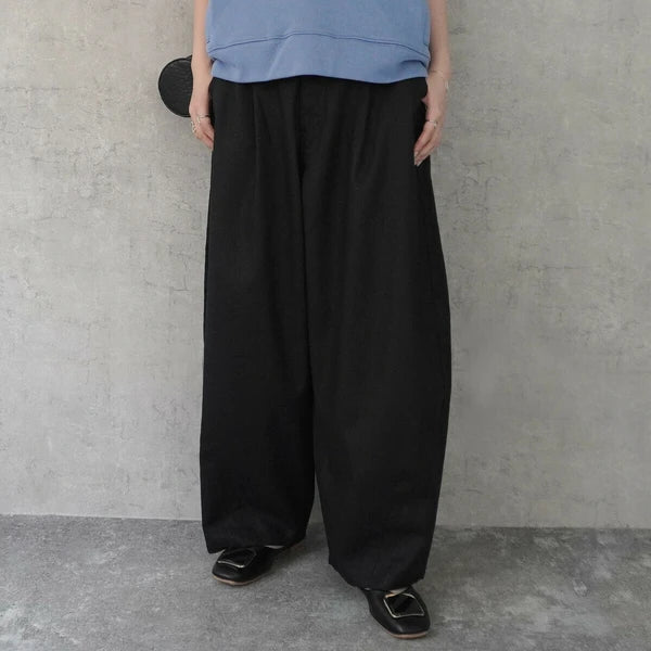 Introducing 100% linen circus pants with a soft curved silhouette. The breathable, durable fabric offers comfort year-round—cool in summer, warm in winter. A relaxed, rounded shape adds a playful touch while staying polished. Designed with front tucks for a clean waistline, they're easy to style with wide belts or casual tops.