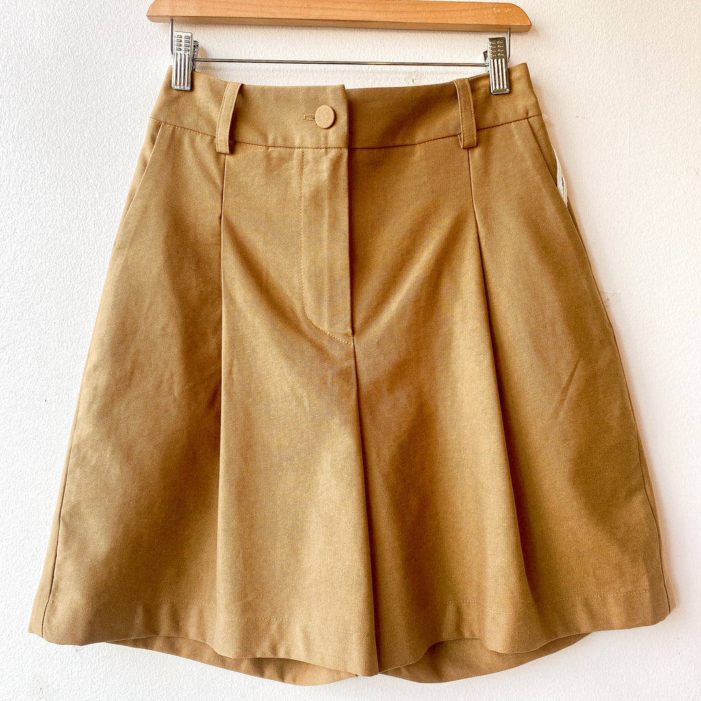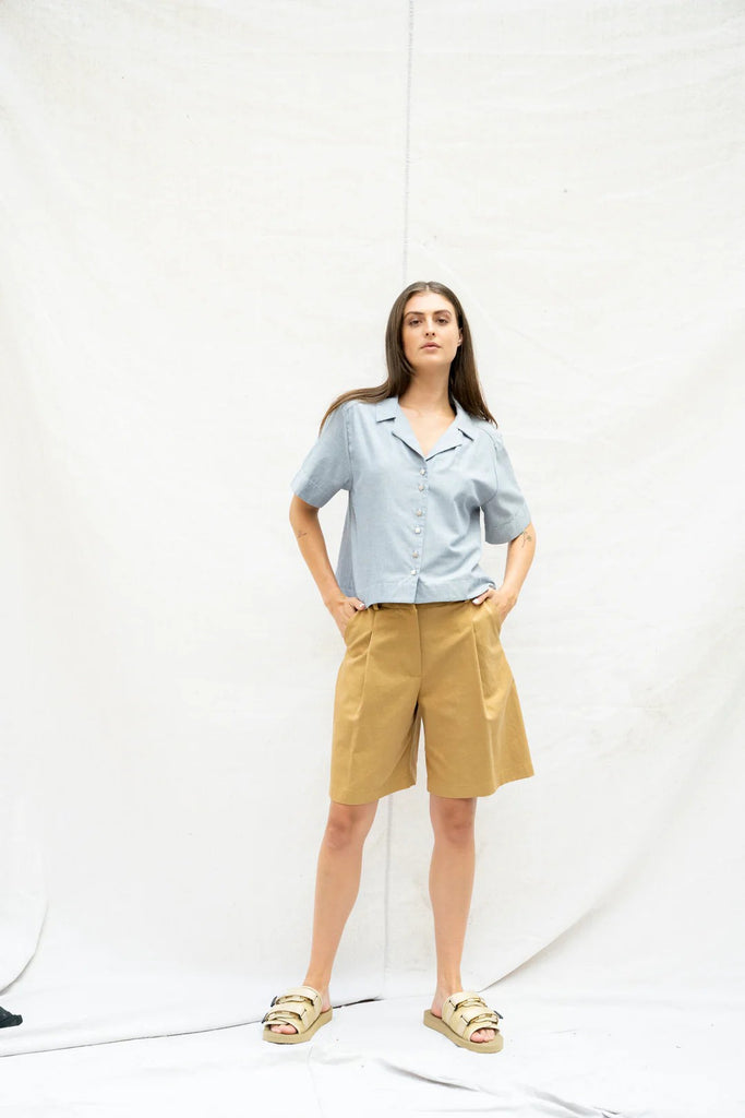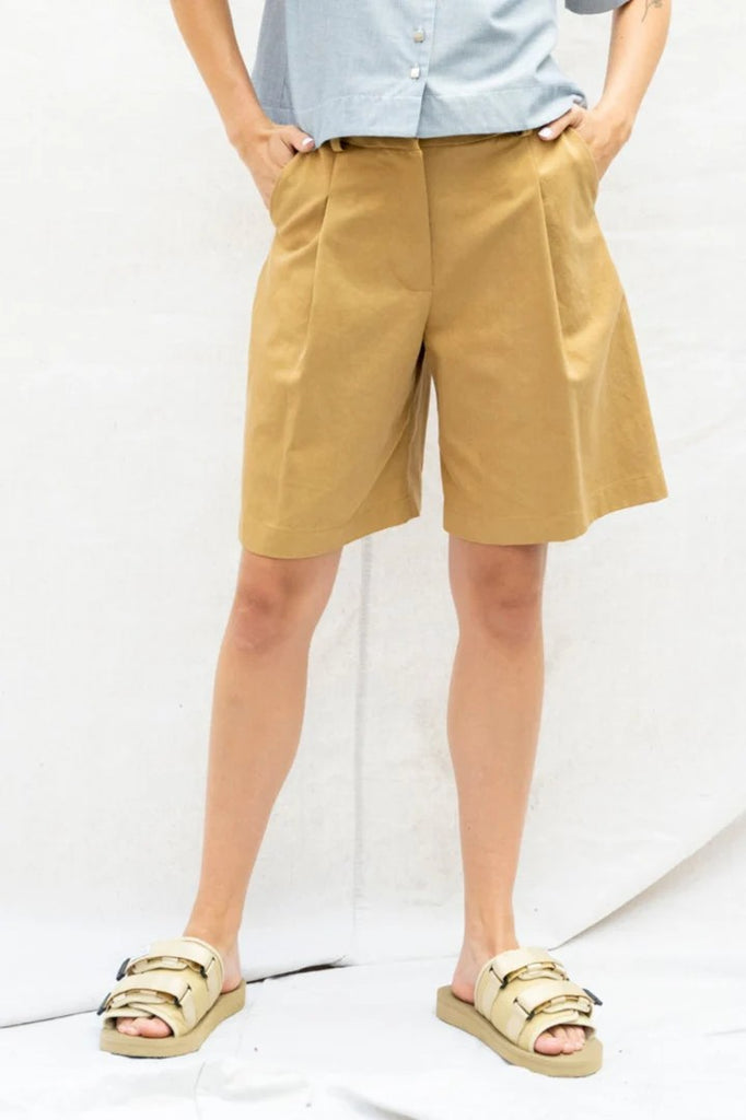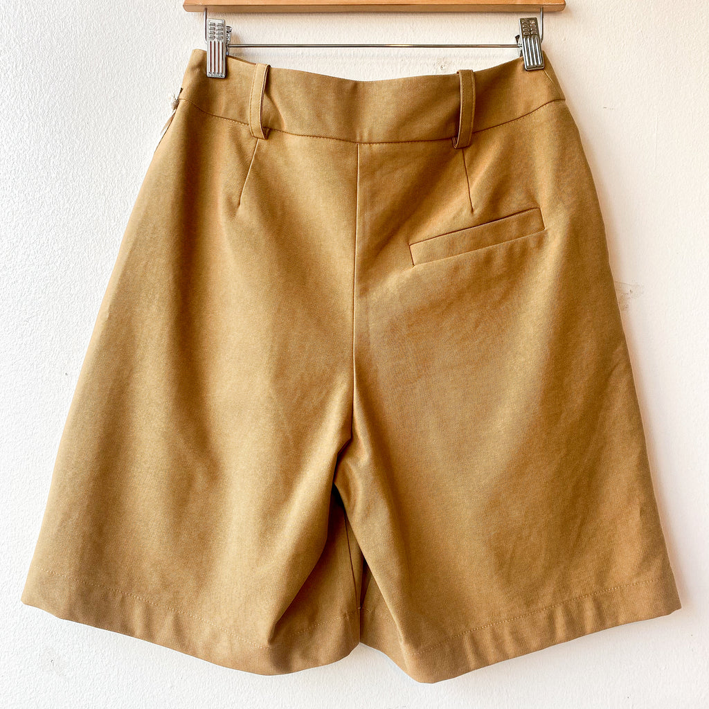Above the knee bermudas with belt loops and pockets. The bermudas feature an added pleat on the front.