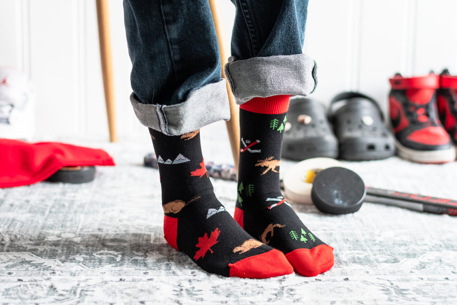 These fun socks feature a playful mix of iconic Canadian symbols, perfect for celebrating all things maple leaf and moose. Mismatched and marvelous, they're a great way for the whole family to show their Canadian spirit! Adult versions also available.
