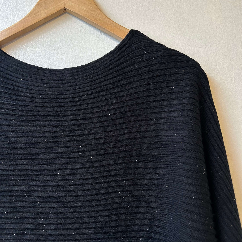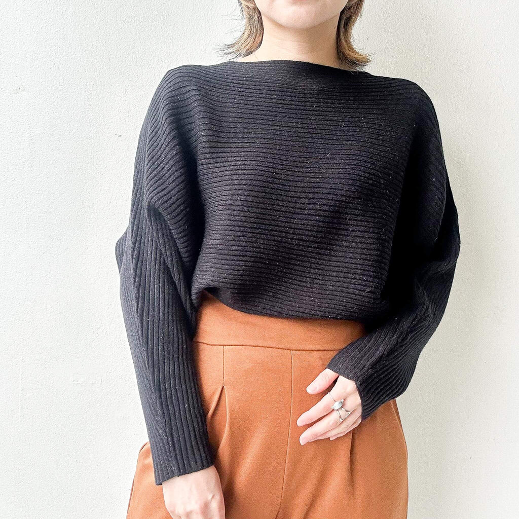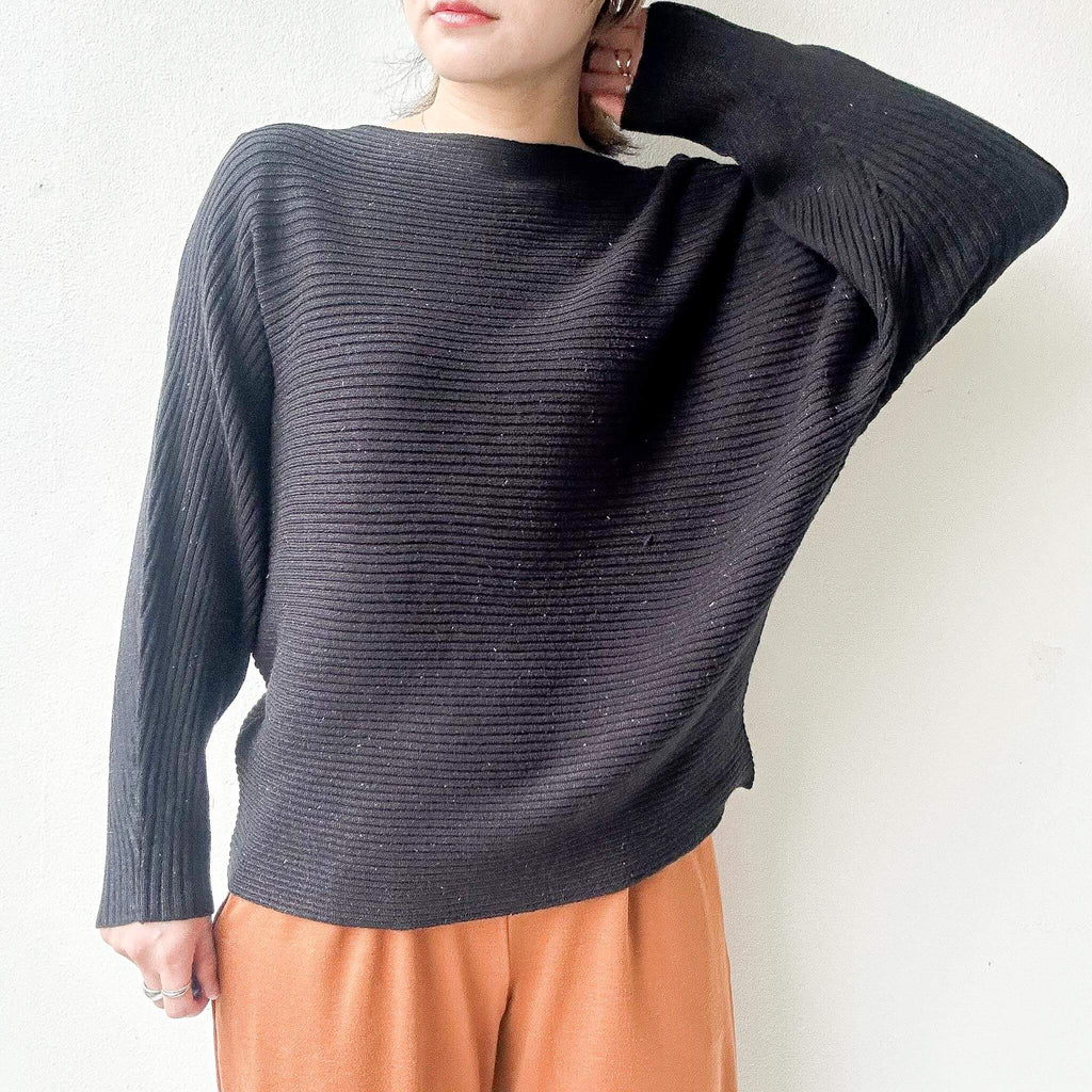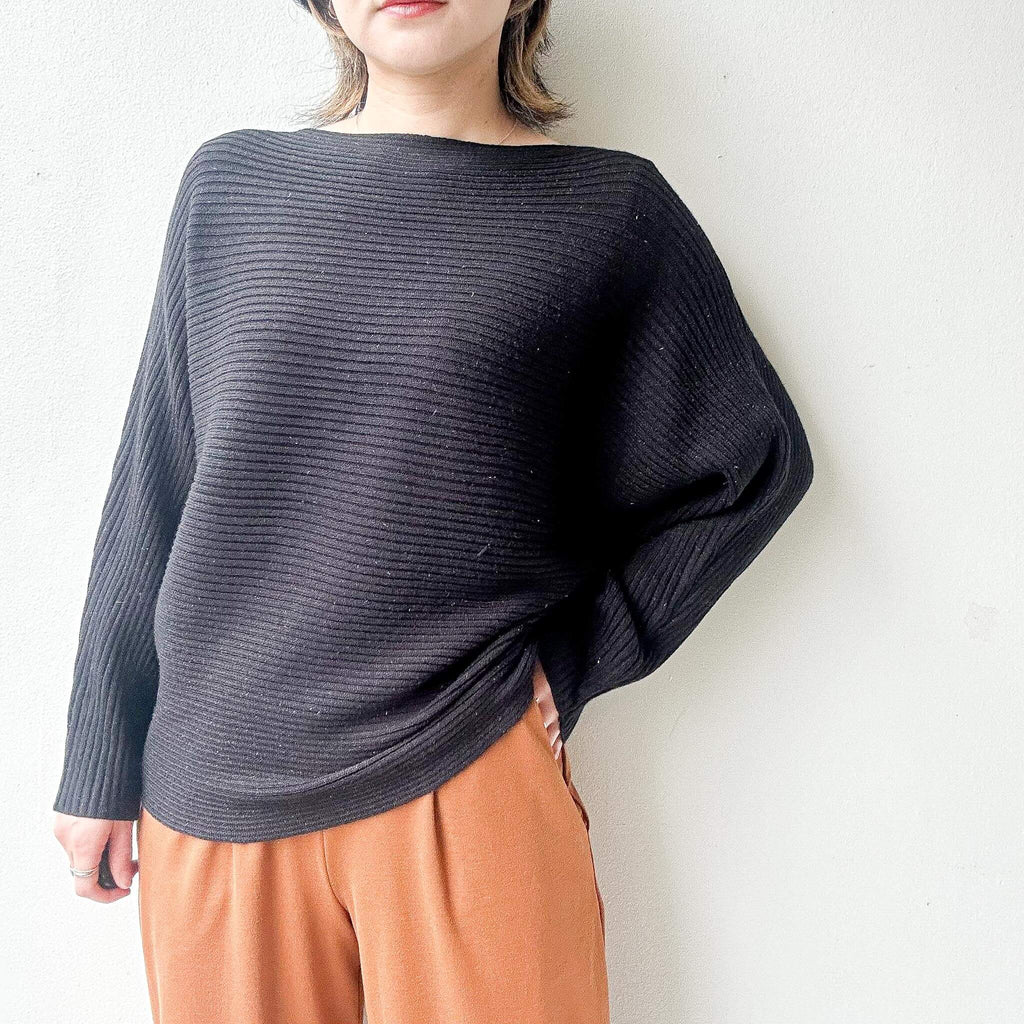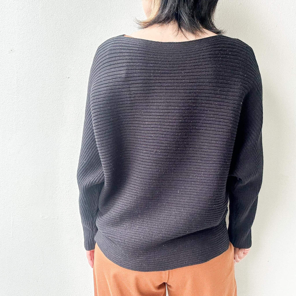 This silky-smooth boat neck dolman knit pullover features a subtle blend of shimmering lamé yarns for a touch of effortless sophistication. The horizontally ribbed texture adds dimension, while the soft fabric ensures a comfortable fit. Crafted with a perfect mid-weight thickness, it's ideal for wearing from early autumn to winter.