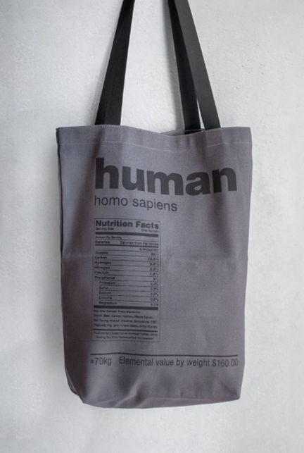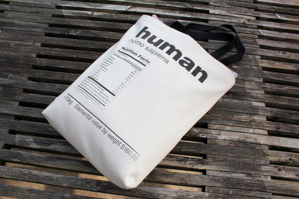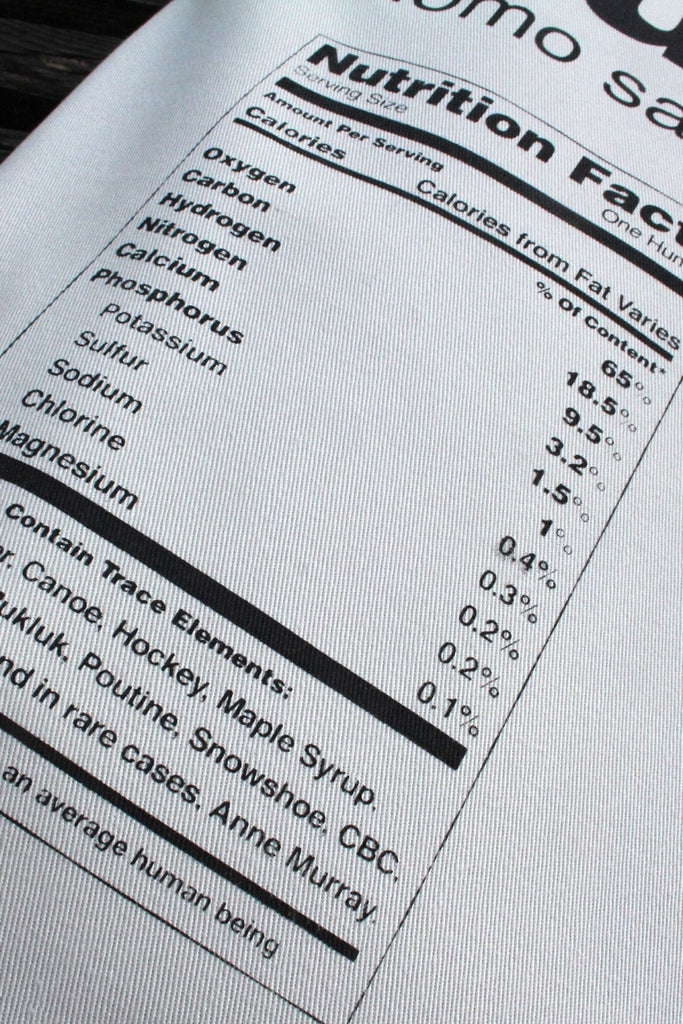 Printed in black on natural or dark grey cotton twill. Hand crafted in Canada. 12w x 16h x 4d"