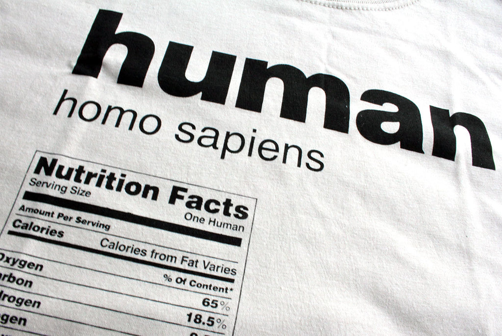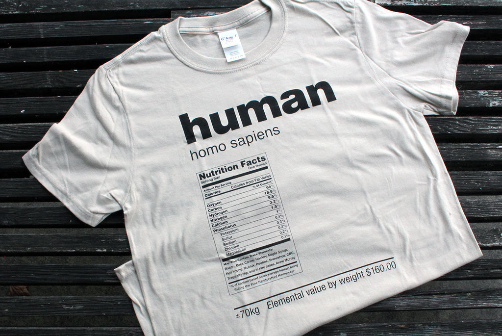 Hand screened Human - Homo Sapiens design. Printed on unisex T-shirt in black on charcoal or sand. Hand crafted in Canada.