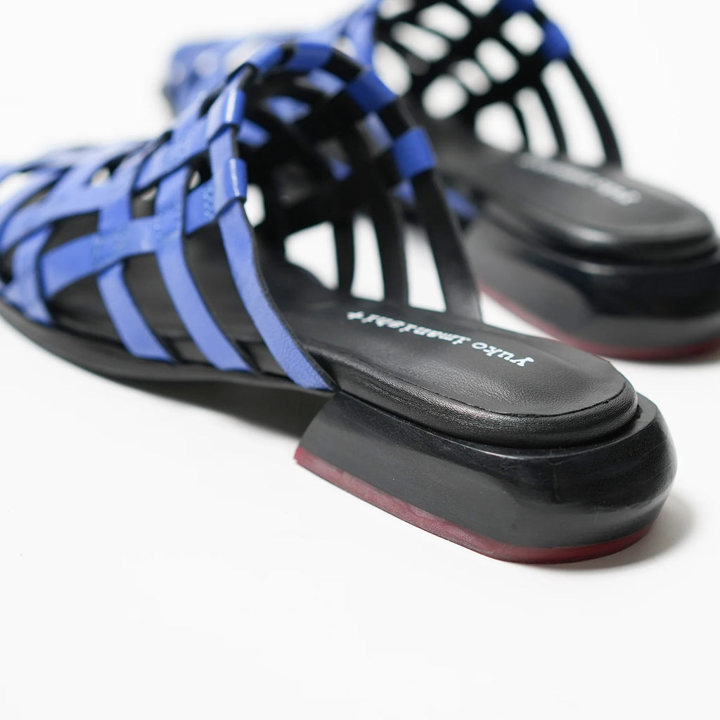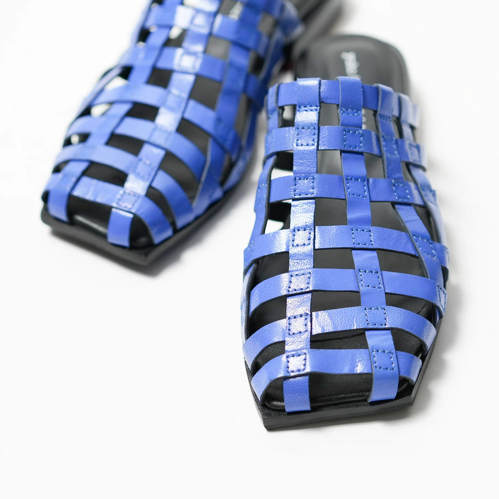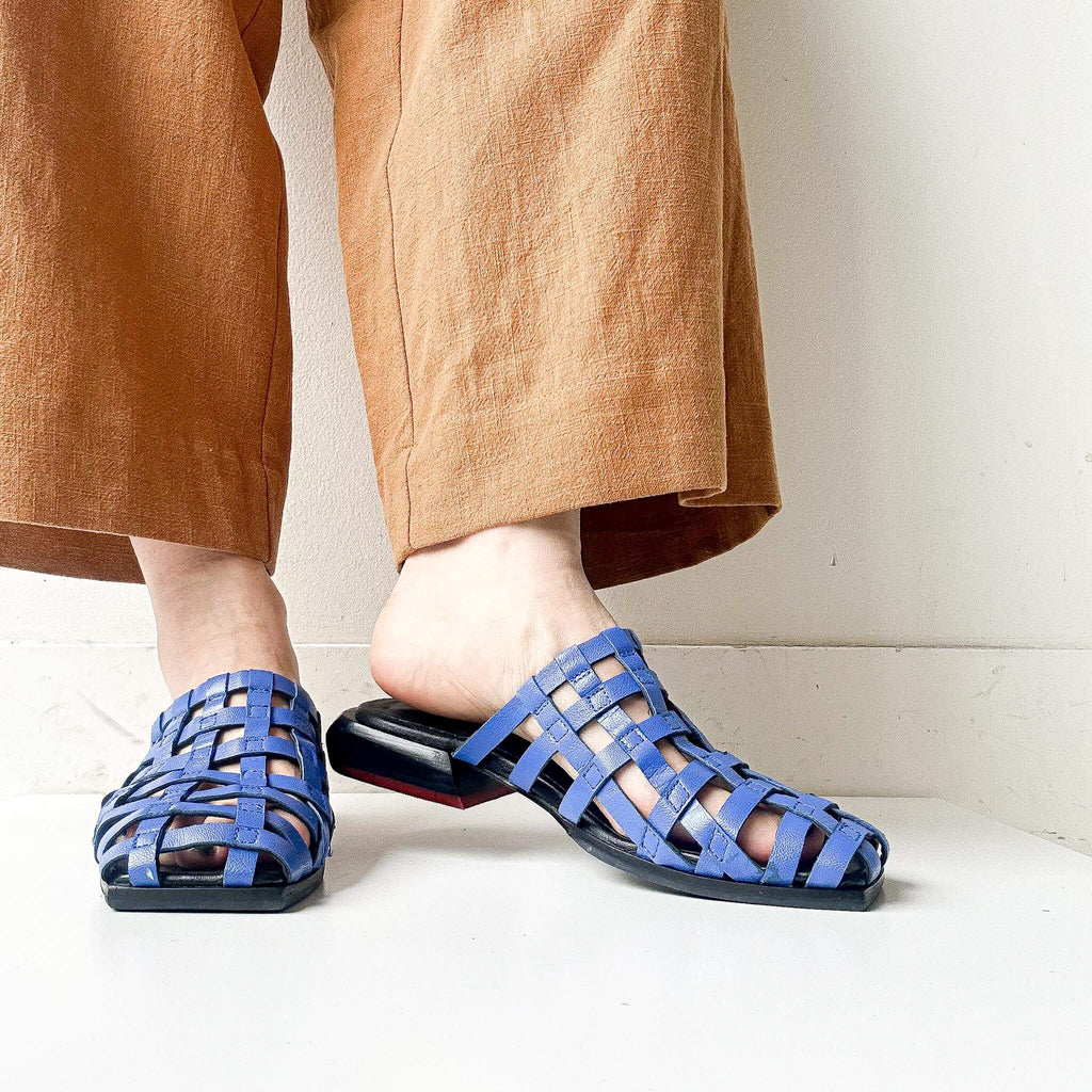 These pumps feature a square toe and a wooden last, crafted with lattice-patterned leather for a unique touch. Versatile in styling, they can be worn comfortably with either bare feet or socks.