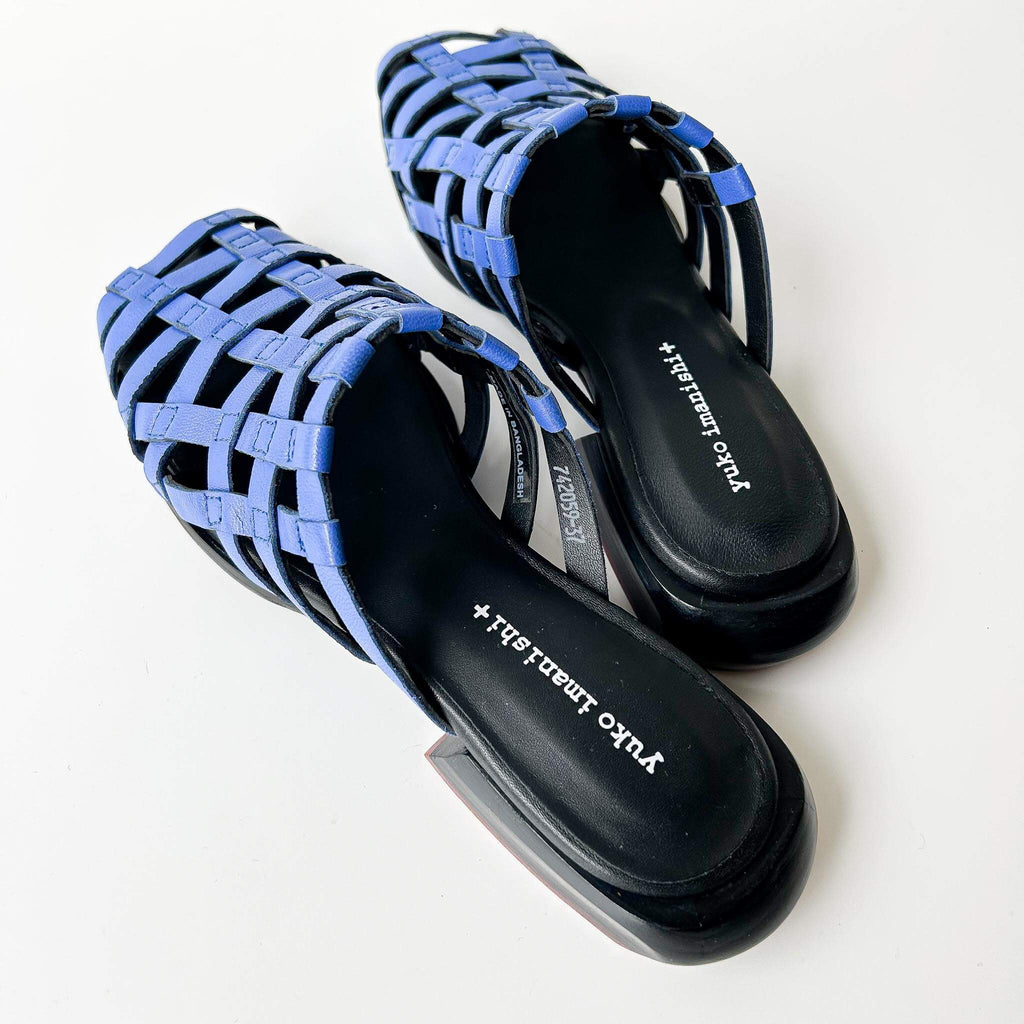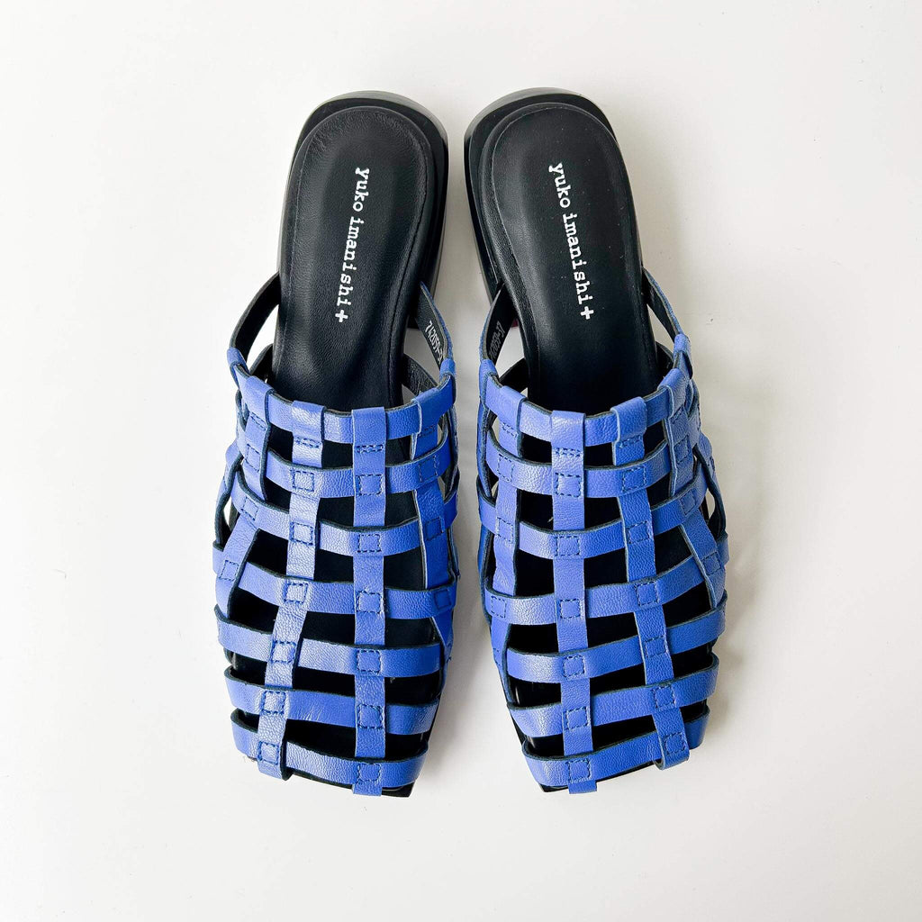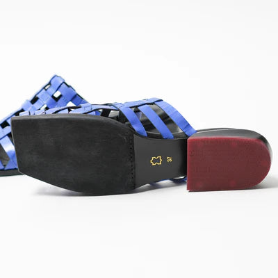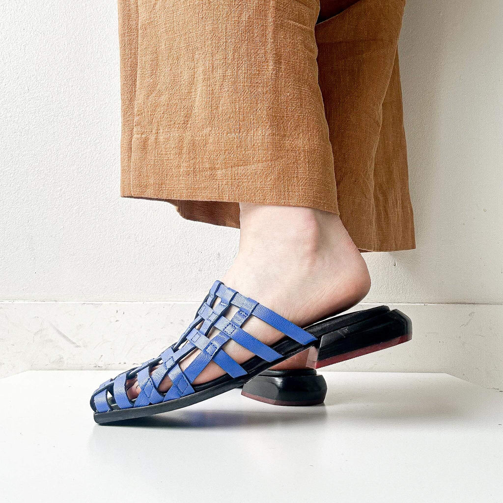 These pumps feature a square toe and a wooden last, crafted with lattice-patterned leather for a unique touch. Versatile in styling, they can be worn comfortably with either bare feet or socks.