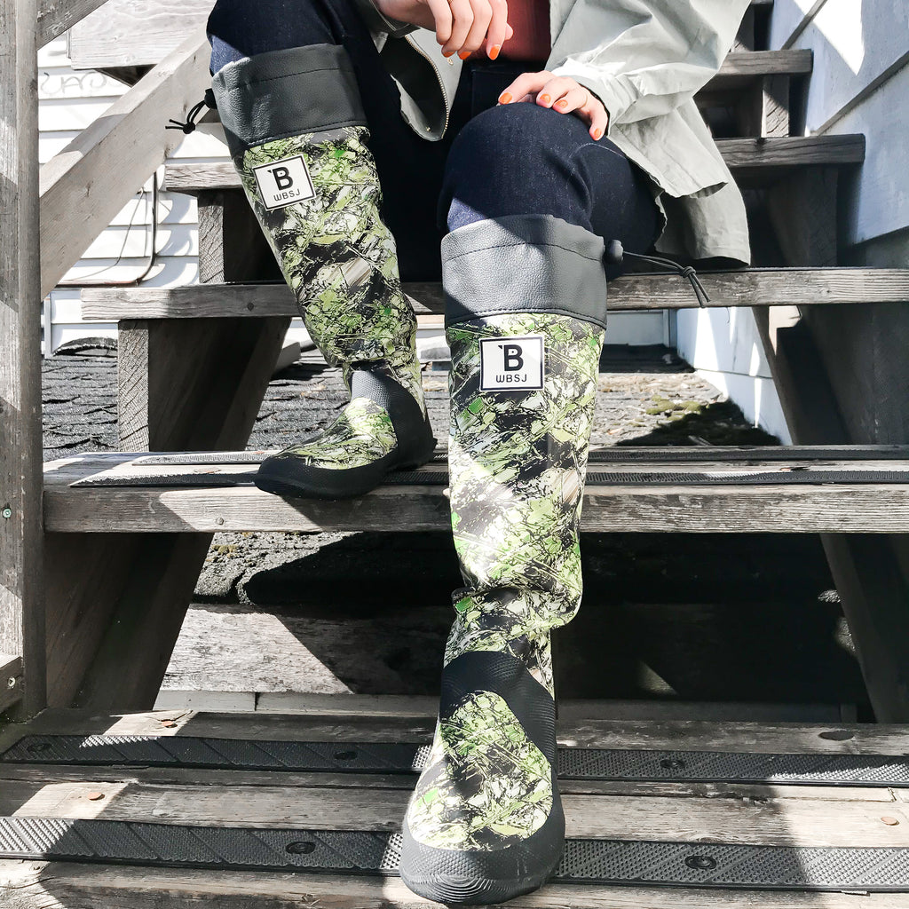 WBSJ's very stylish rain boots are perfect for active people. They are loose enough to wear jeans in the boots but fit tight on the ankle to keep from slipping off when working in muddy gardens, or walking in the swamps while bird watching. They have been specially designed to be taken off by stepping on the heel of the opposite boot-a hands-free approach.